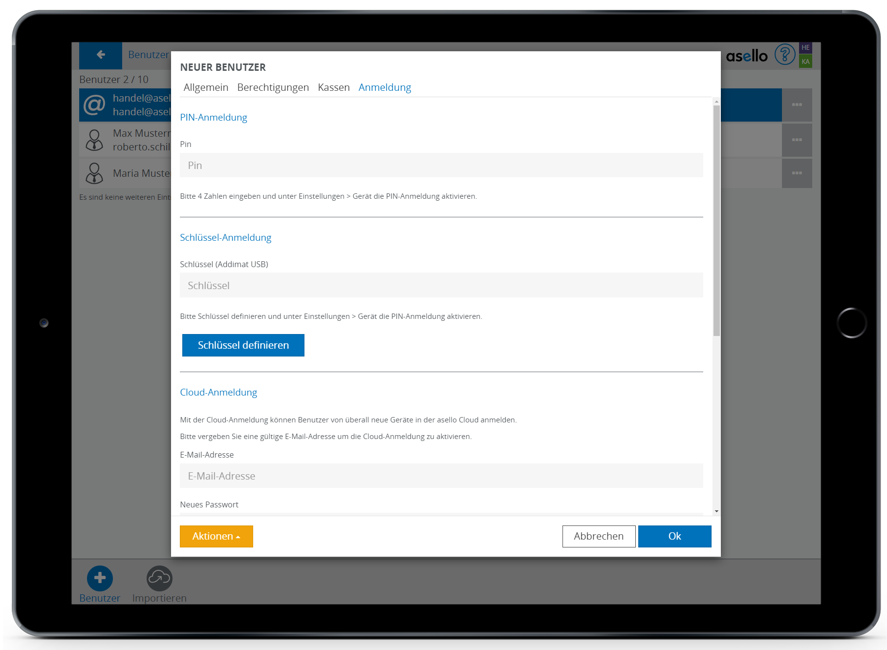 Klicken Sie auf den Benutzer, dem Sie einen PIN zuteilen möchten. Nun erscheint ein Pop-Up-Feld. In diesem wählen Sie die Registerkarte „Anmeldung“ aus. Im Unterpunkt PIN-Anmeldung tragen Sie, im Feld PIN, eine vierstellige Zahlenkombination ein. Beachten Sie das jede Zahlkombination nur einmal pro asello Account vergeben werden kann. Haben Sie den PIN eingetragen, klicken Sie auf den blauen Button „OK“ im rechten unteren Eck, um die Daten zu speichern. Der Pin für den Benutzer gilt immer pro asello-Account und wird zwischen mehreren Geräten synchronisiert.