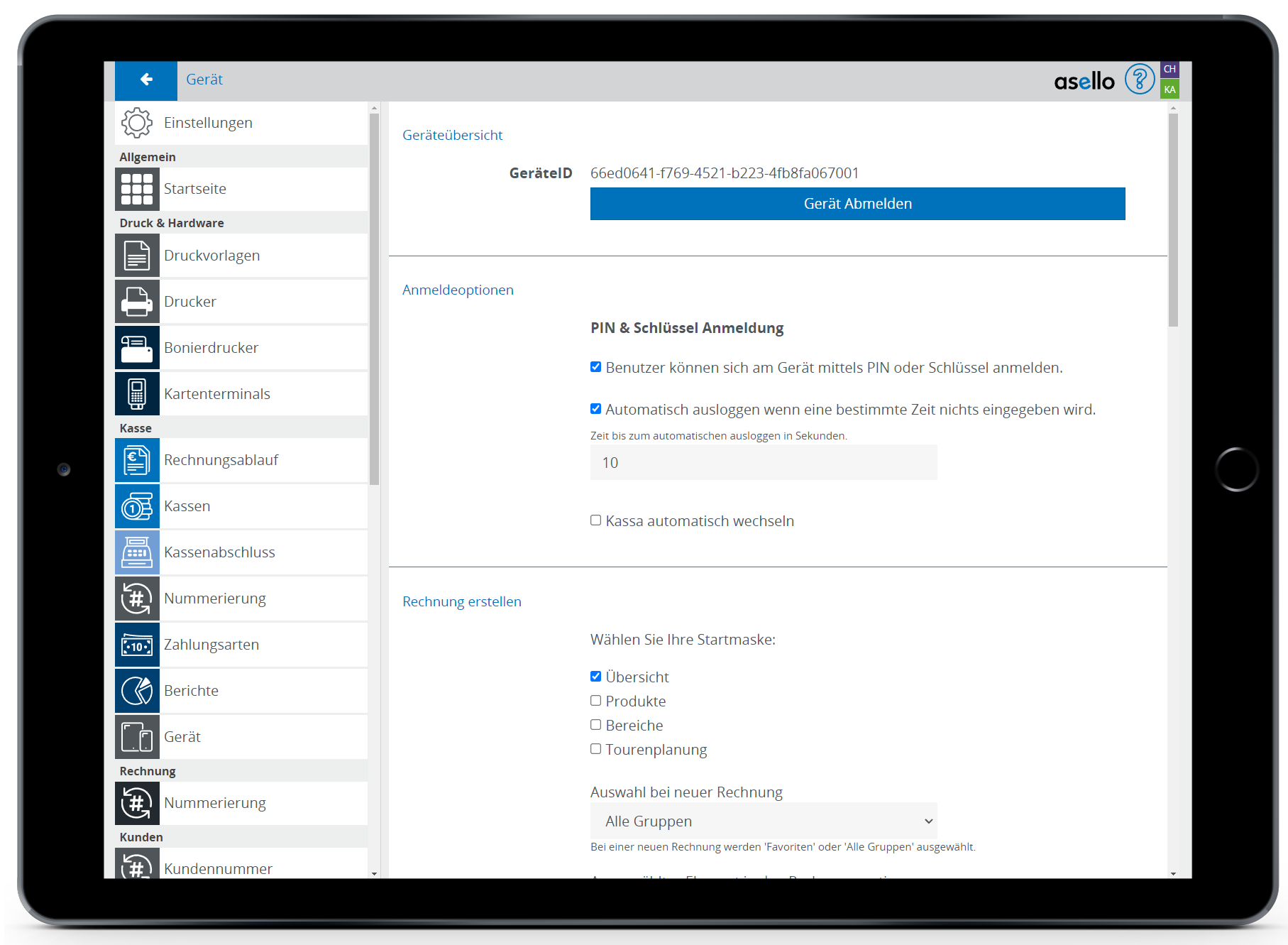 Um die PIN-Anmeldung für ein Gerät zu aktivieren wechseln Sie auf die asello Startseite. Klicken Sie dafür auf das asello Logo im rechten oberen Eck. Anschließend klicken Sie auf die graue Kachel „Einstellungen“. Scrollen Sie dann am linken Bildschirmrand bis zum Abschnitt „Rechnungsablauf hinunter und klicken auf den Unterpunkt Gerät.