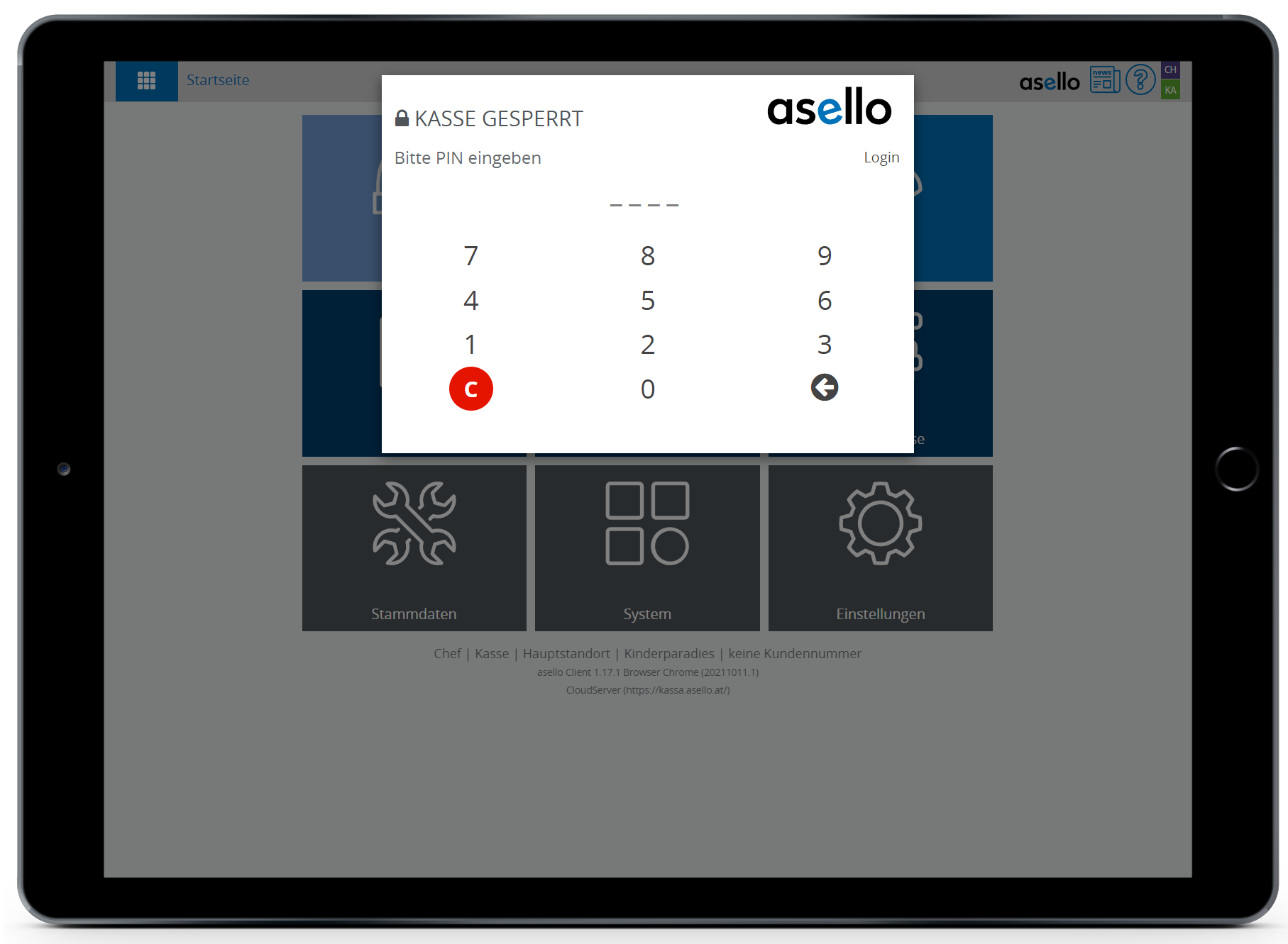Um die PIN-Anmeldung zu testen klicken Sie auf das asello Logo, um zur Startseite zurückzugelangen. Klicken Sie erneut auf das asello Logo, so wird die Kasse gesperrt und Sie benötigen den PIN, um sich wieder einzuloggen. Nun sind Sie mit dem Benutzer Josef asello angemeldet und es könne nur Aktionen ausgeführt werden, für welche der Benutzer eine Berechtigung hat.