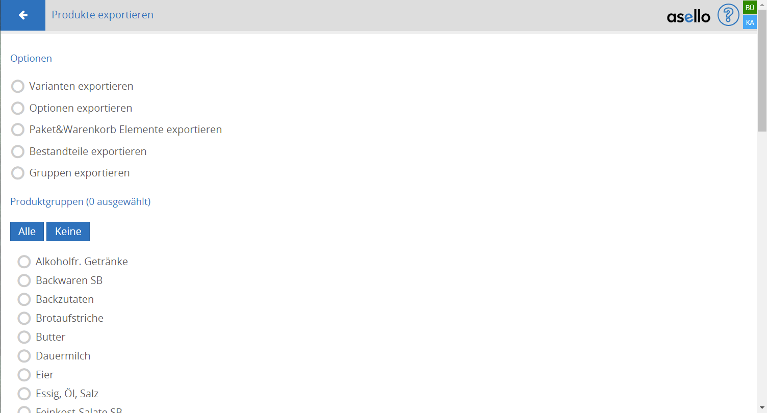 In asello unter Produkte einen Export der Produkte ziehen. Dabei sollten alle Optionen abgewählt werden.