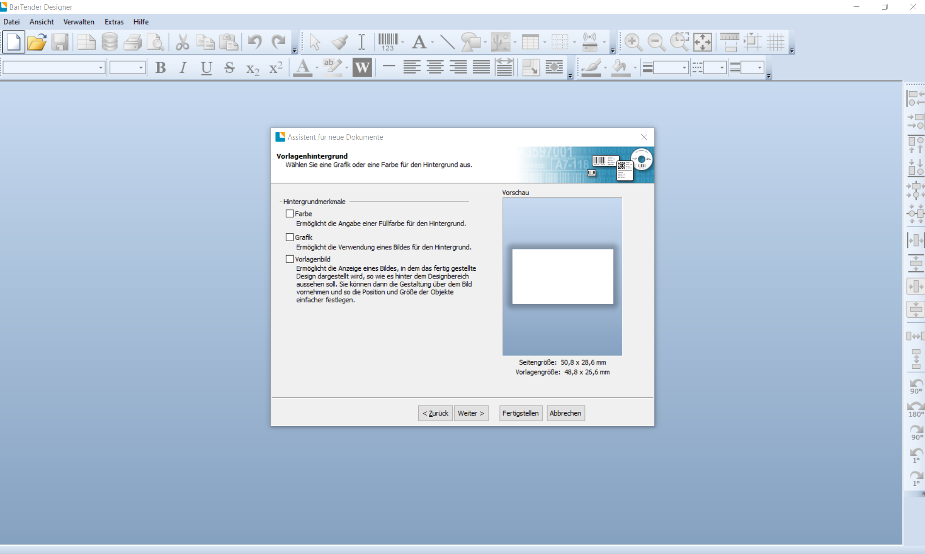 Hier besteht die Möglichkeit den Hintergrund einzustellen wie bspw. Mit einem Wasserzeichen, Firmenlogo oder einer Vollflächigen Farbe. Für unser Beispiel spielt das hierbei keine Rolle und wird mit weiter bestätigt.