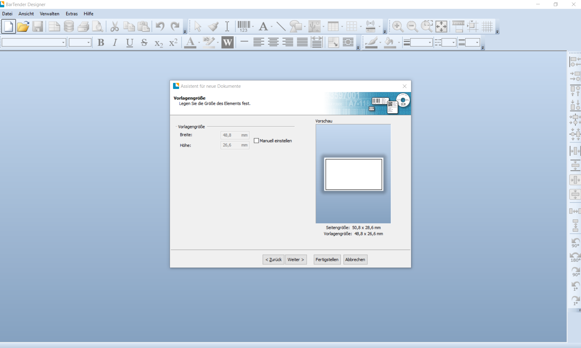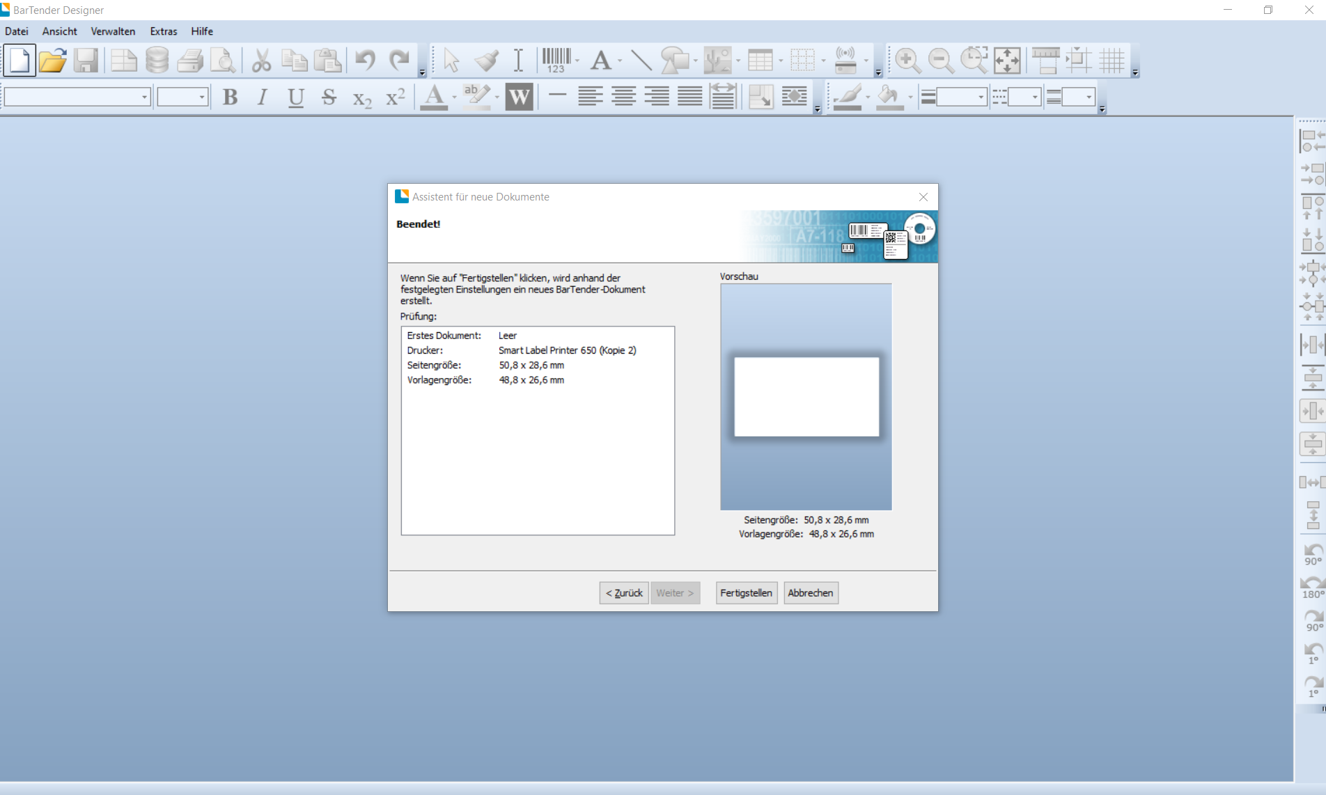 In diesem Schritt zeigt der "Assistent für neue Dokumente" eine Übersicht der Einstellungen, welche mit "Fertigstellen" bestätigt werden.