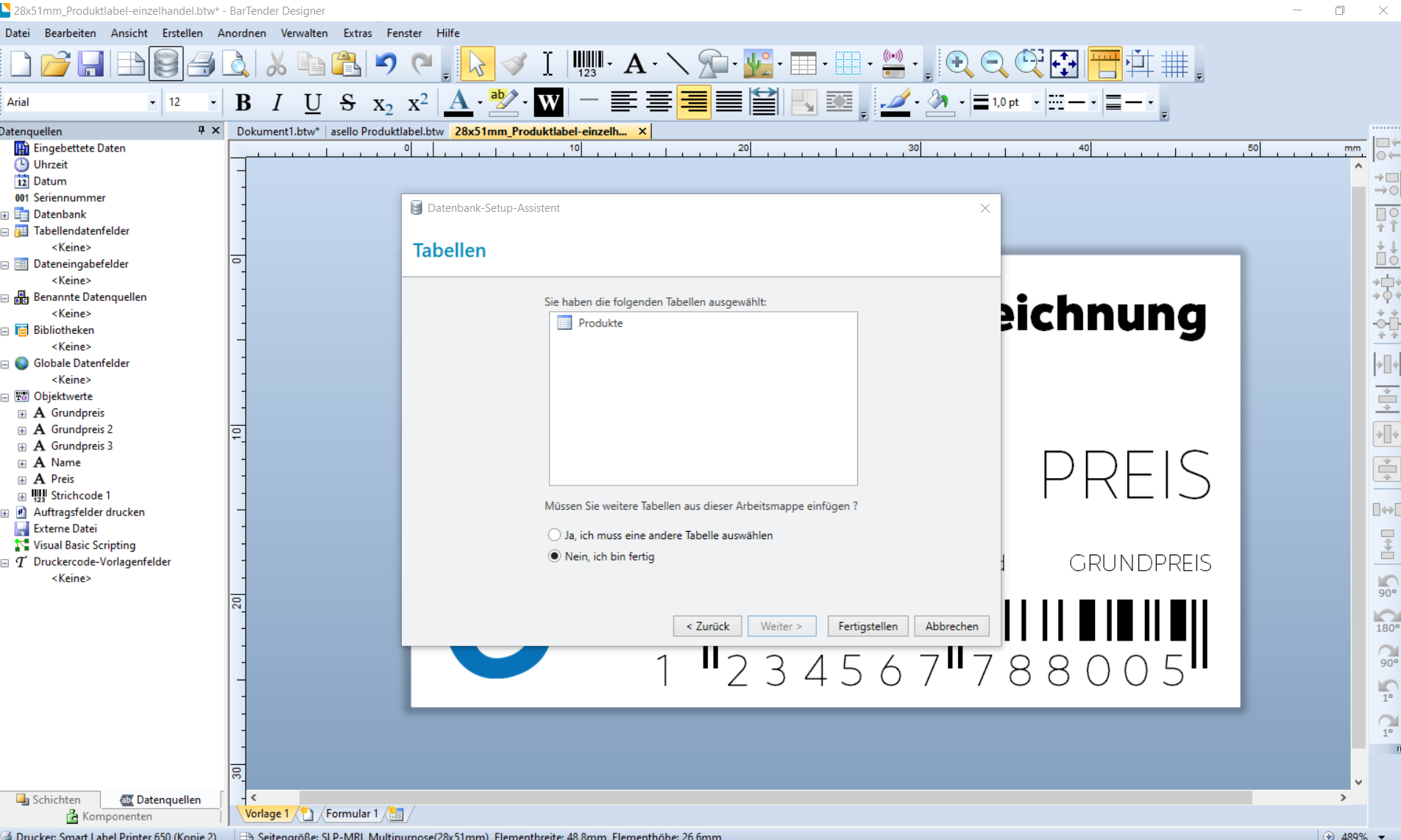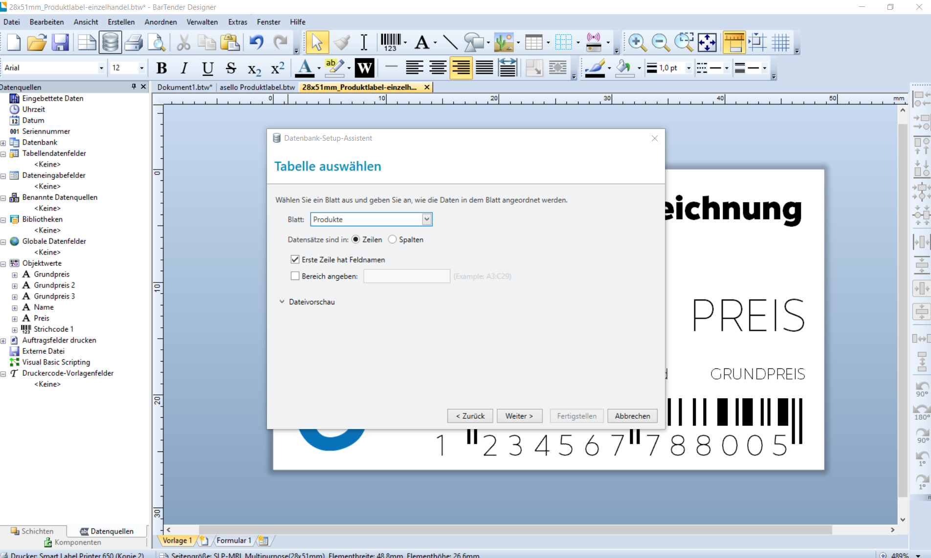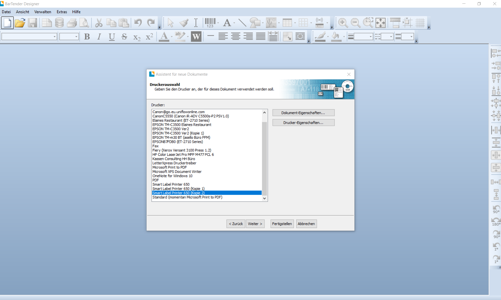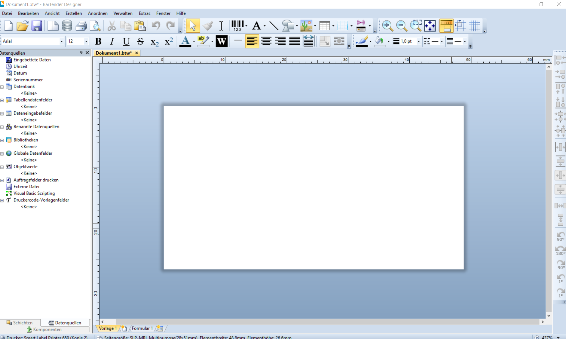 Nachdem Export, die Labelsoftware "BarTender" starten und eine Labelvorlage erstellen. In unserem Beispiel erzeugen wir ein Label, passend auf den SLP 650. Dieser Drucker ist in asello integriert und kann aus der Kasse heraus direkt angesteuert werden für die Erstellung von Gutscheinen, Kundenkarten sowie einfachen Preisschildern.