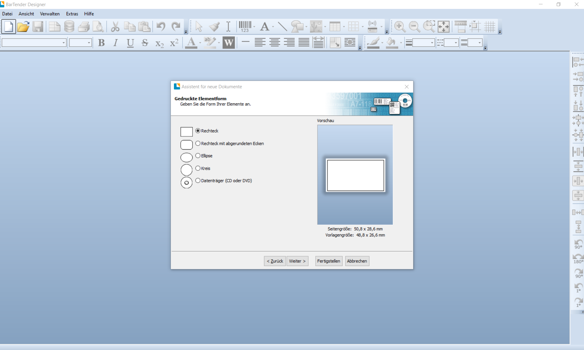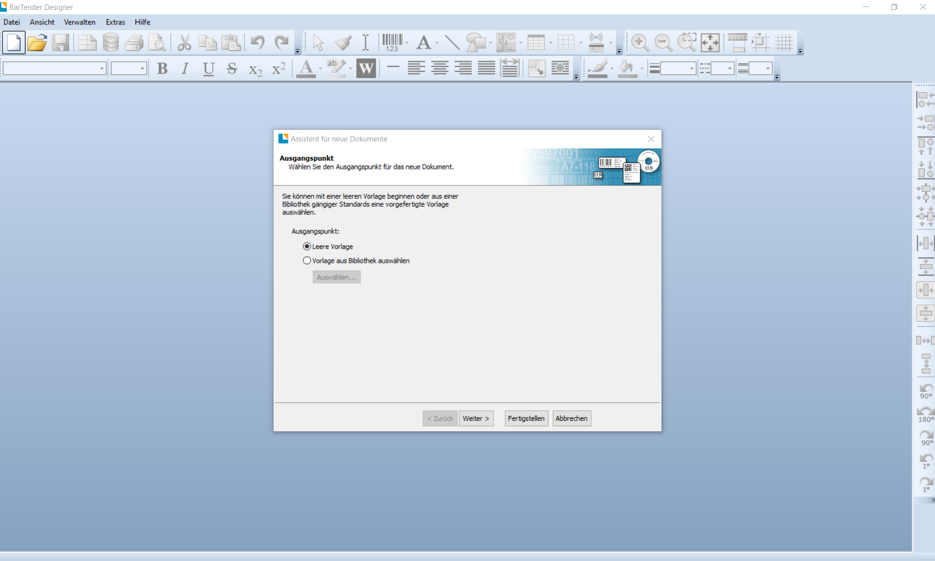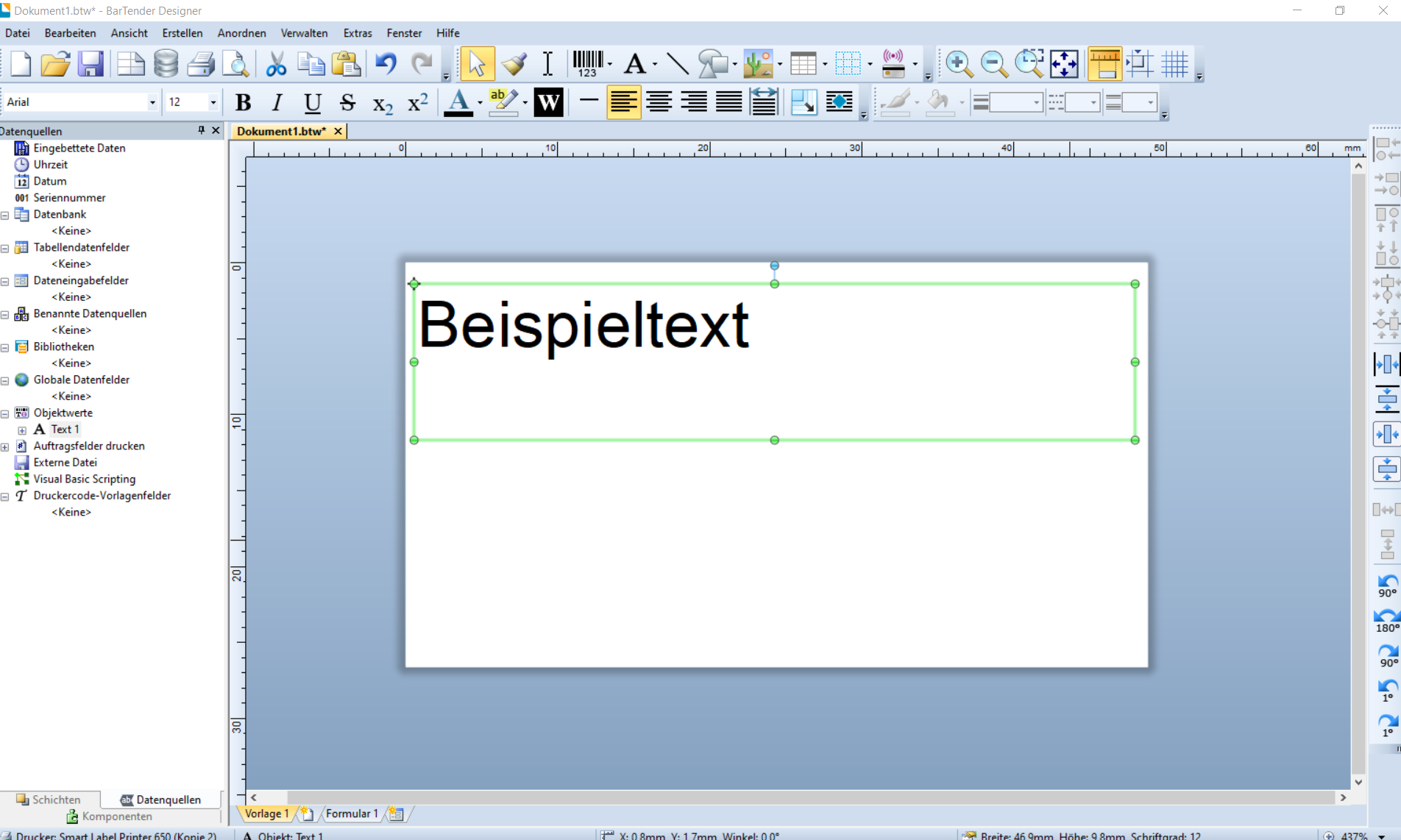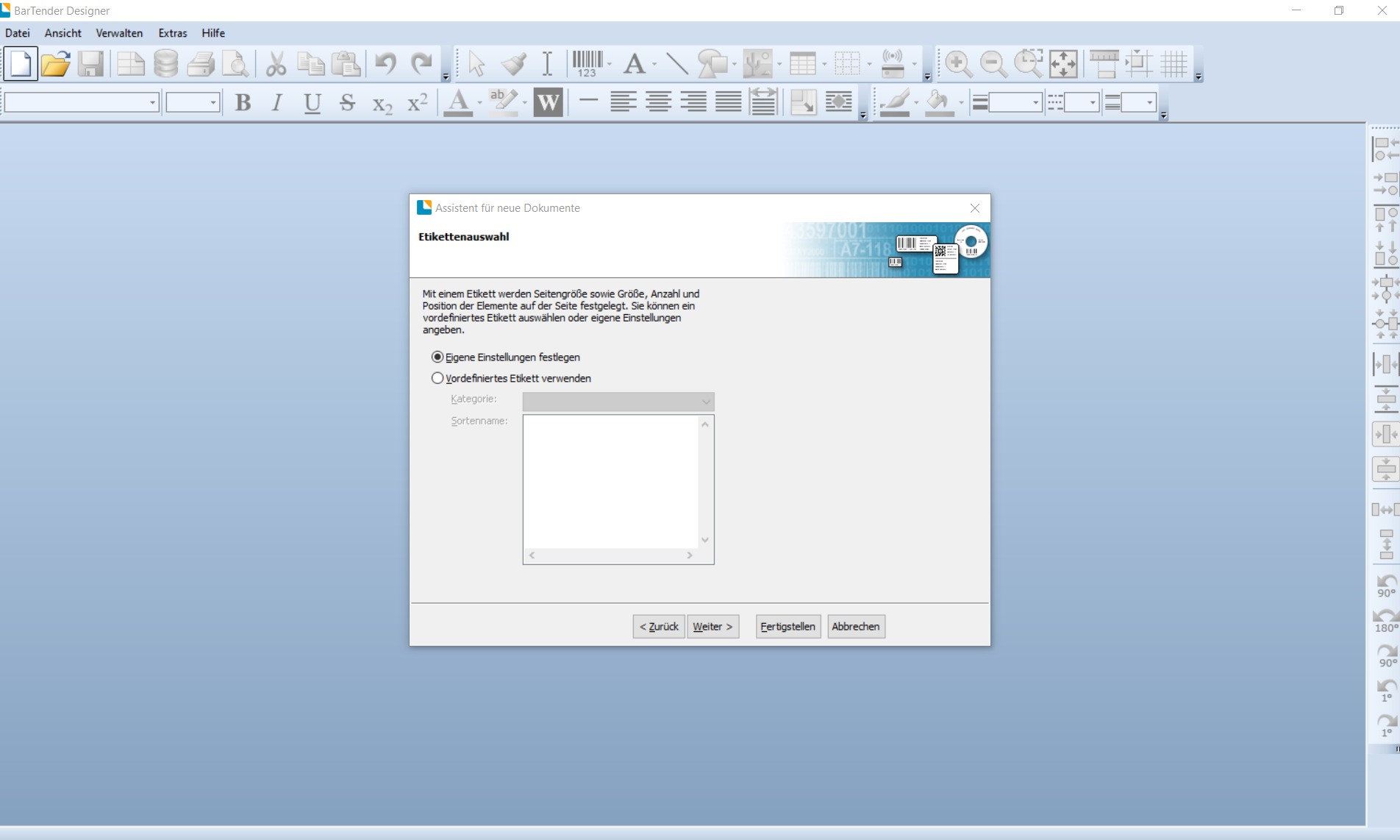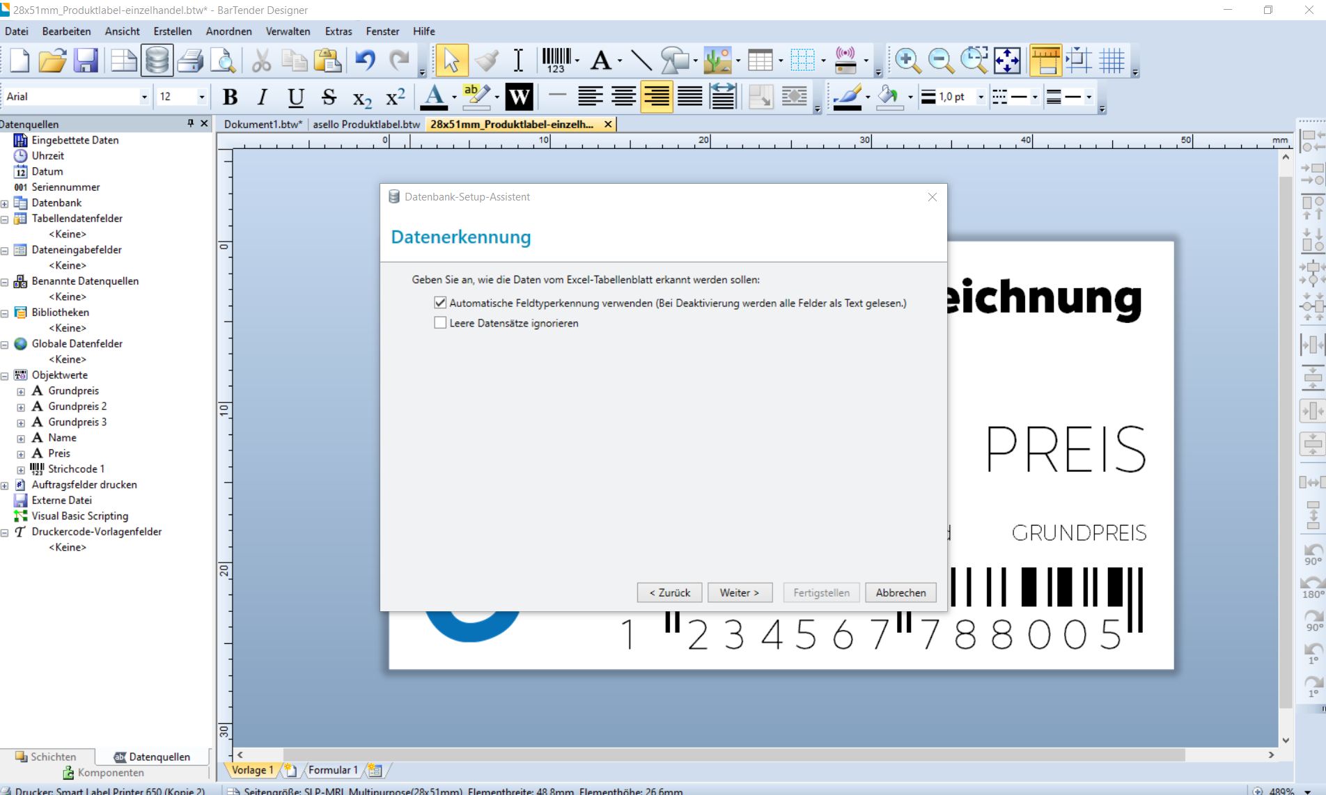 Nachdem Export, die Labelsoftware "BarTender" starten und eine Labelvorlage erstellen. In unserem Beispiel erzeugen wir ein Label, passend auf den SLP 650. Dieser Drucker ist in asello integriert und kann aus der Kasse heraus direkt angesteuert werden für die Erstellung von Gutscheinen, Kundenkarten sowie einfachen Preisschildern.