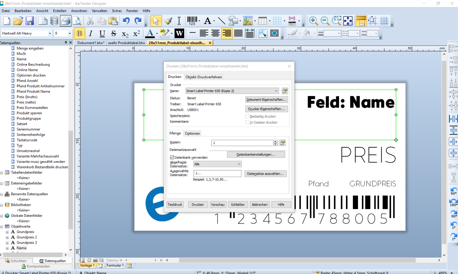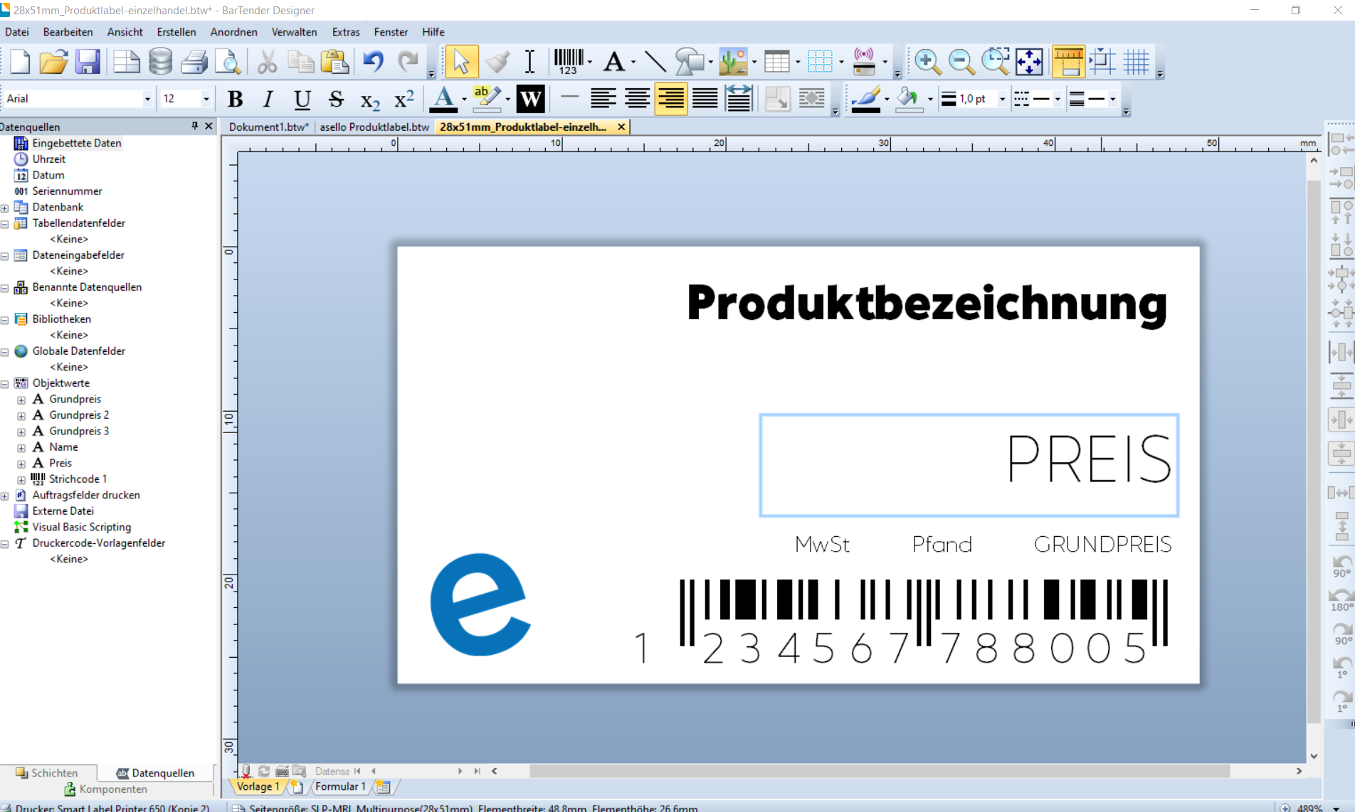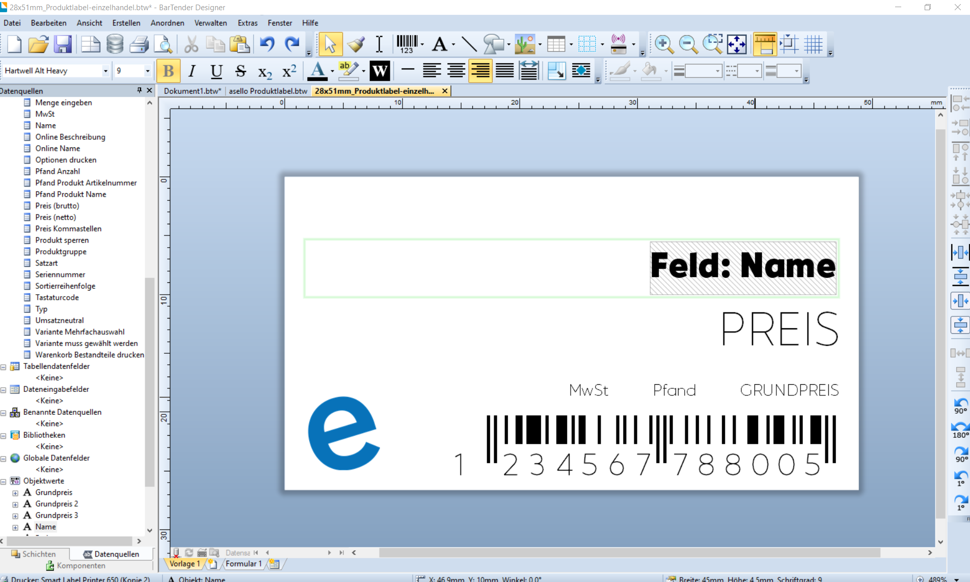 Für den Produktnamen empfiehlt es sich ein Textfeld mit Umbruch zu nehmen und dieses im Label einzuzeichnen. Somit gewährleistet man, dass auch lange Produktnamen auf dem Preislabel aufgedruckt werden.