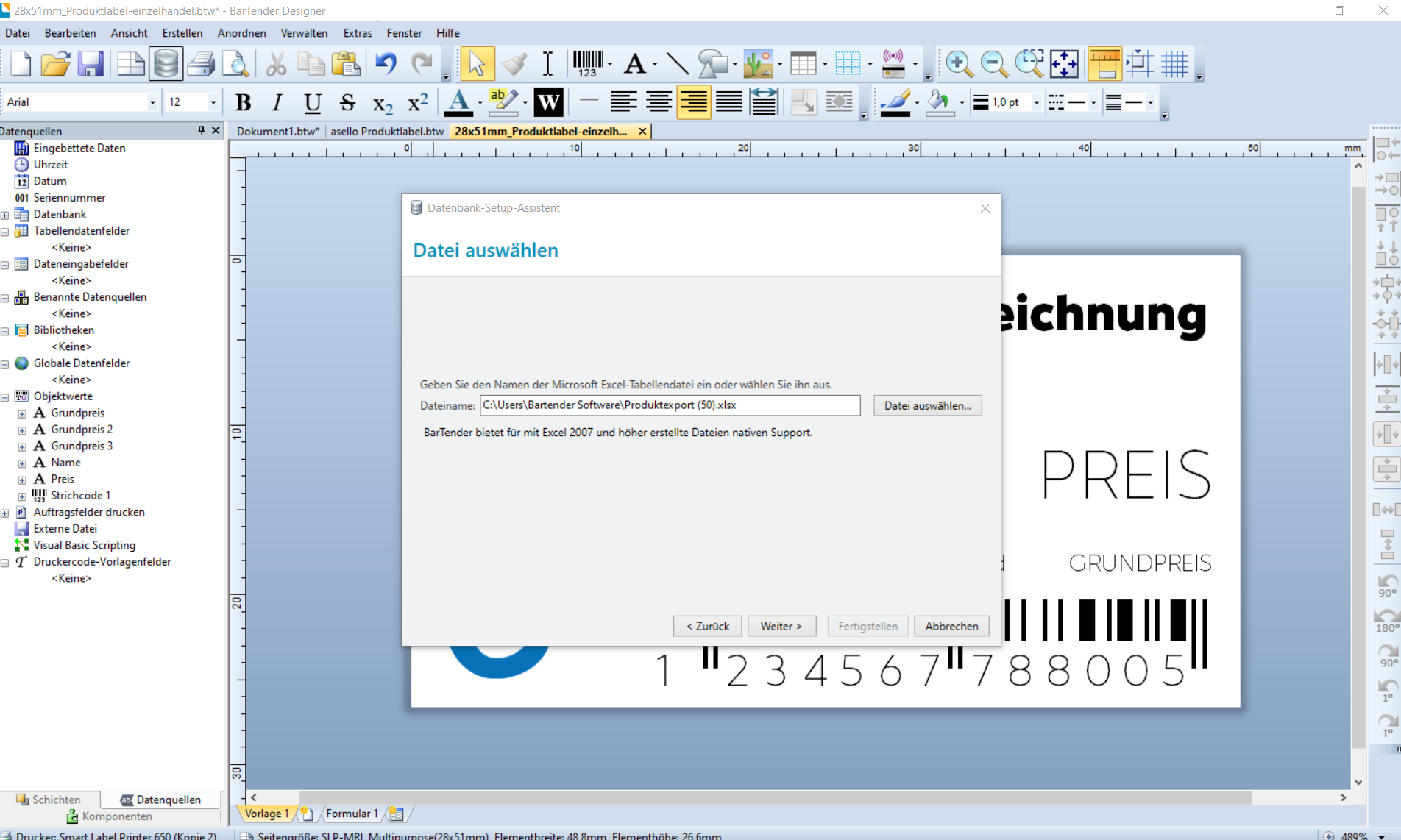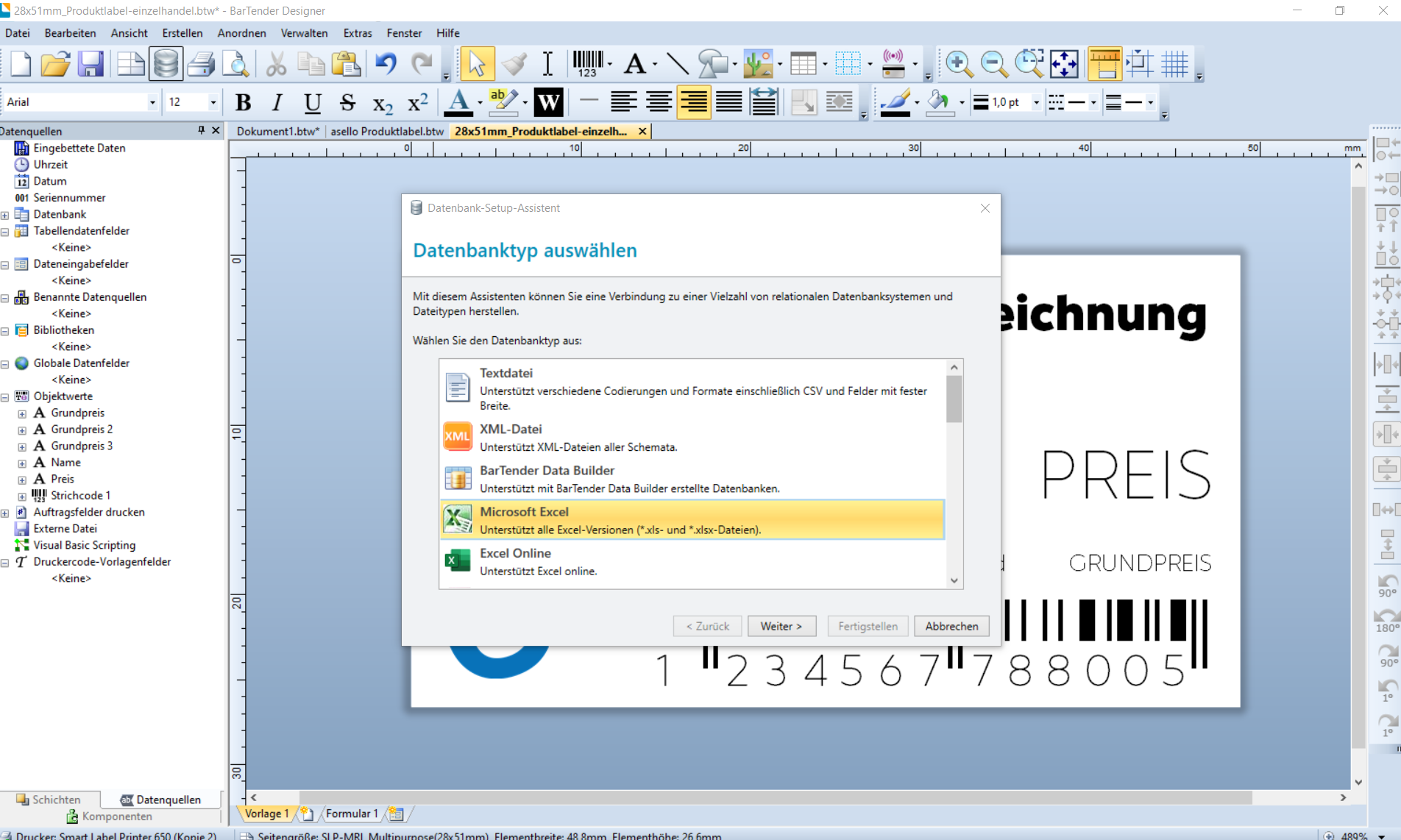 In diesem Schritt wird der vorangegangene Produktexport als Datenbank in "BarTender" hinzugefügt. Dazu wählt man im oberen Bereich das Datenbanksymbol. Danach öffnet sich der Datenbank Setup Assistent bei dem "Microsoft EXCEL" ausgewählt und mit weiter bestätigt wird.