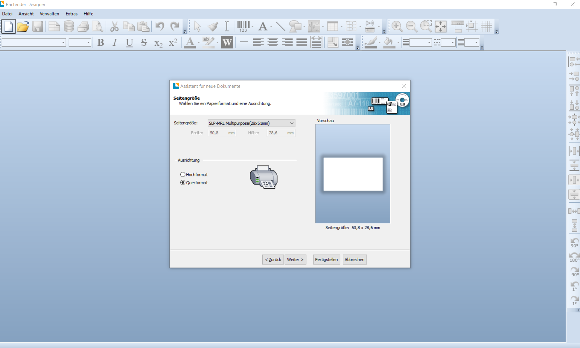 Dadurch, dass der SLP 650 bereits in Windows 10 Installiert und mit dem Standardlabel SLP-MRL eingestellt ist, erkennt "BarTender Designer" diese Einstellungen und schlägt diese vor.
