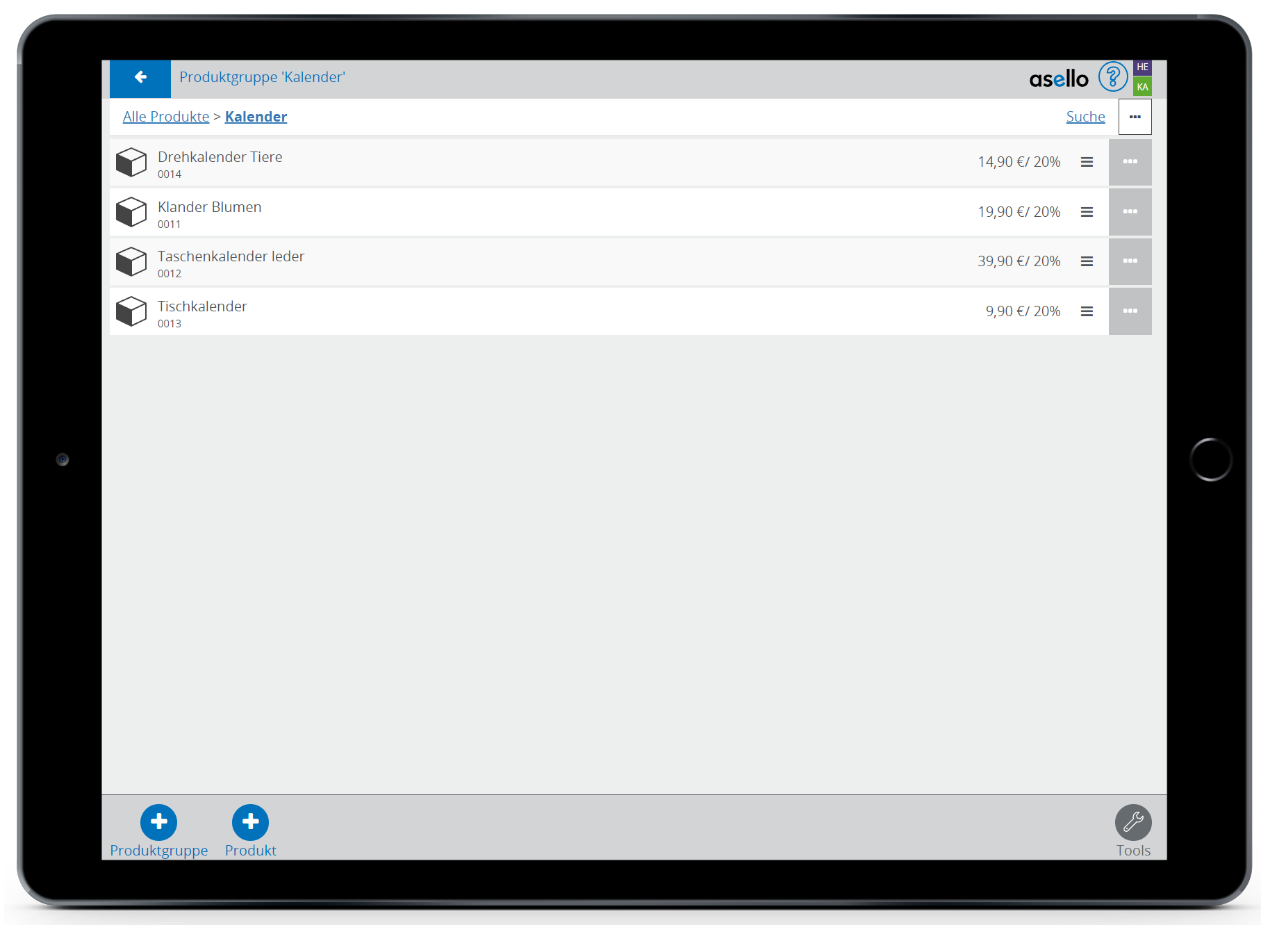 Um ein Produkt mit verschiedenen Varianten zu erstellen klicken Sie auf der asello Startseite auf die graue Kachel Stammdaten und anschließend auf die orange Kachel „Produkte“. Nun sind Sie auf der Seite mit den Hauptgruppen. In diesem Beispiel möchten wir das Produkt „Blumenerde“ in der Produktgruppe "Blumenerde" erstellen.