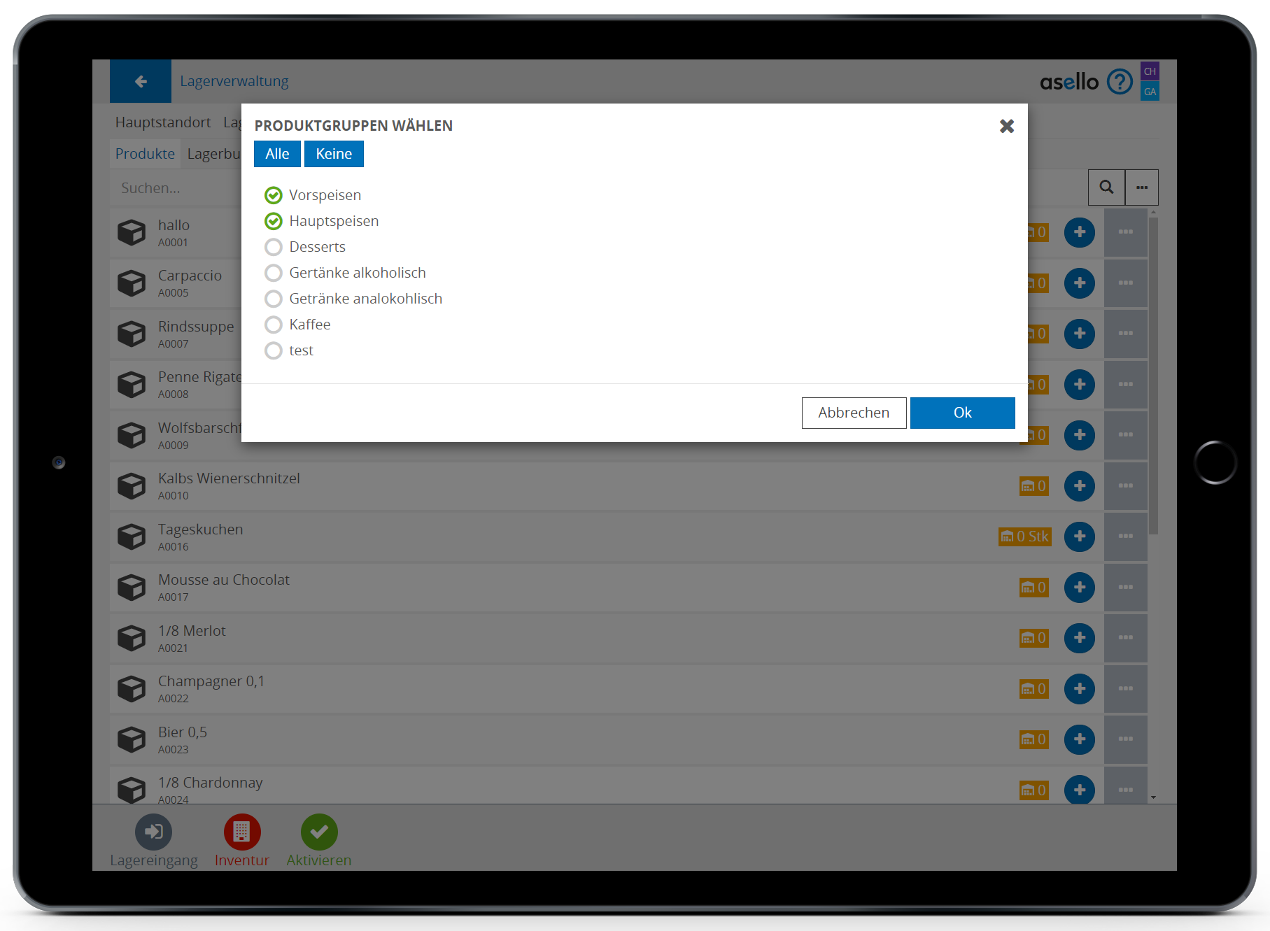 Nun erscheint ein Pop-Up-Fenster. In diesem werden Ihnen alle Ihre Produktgruppen angezeigt. Um eine Produktgruppe für die Lagerverwaltung zu aktivieren, setzten Sie vor diese ein blaues Häkchen. Um die Lagerverwaltung für die Auswahl abschließend zu aktivieren, klicken Sie auf den blauen Button „OK".