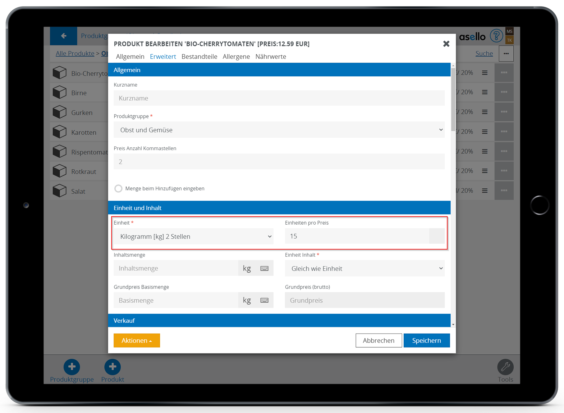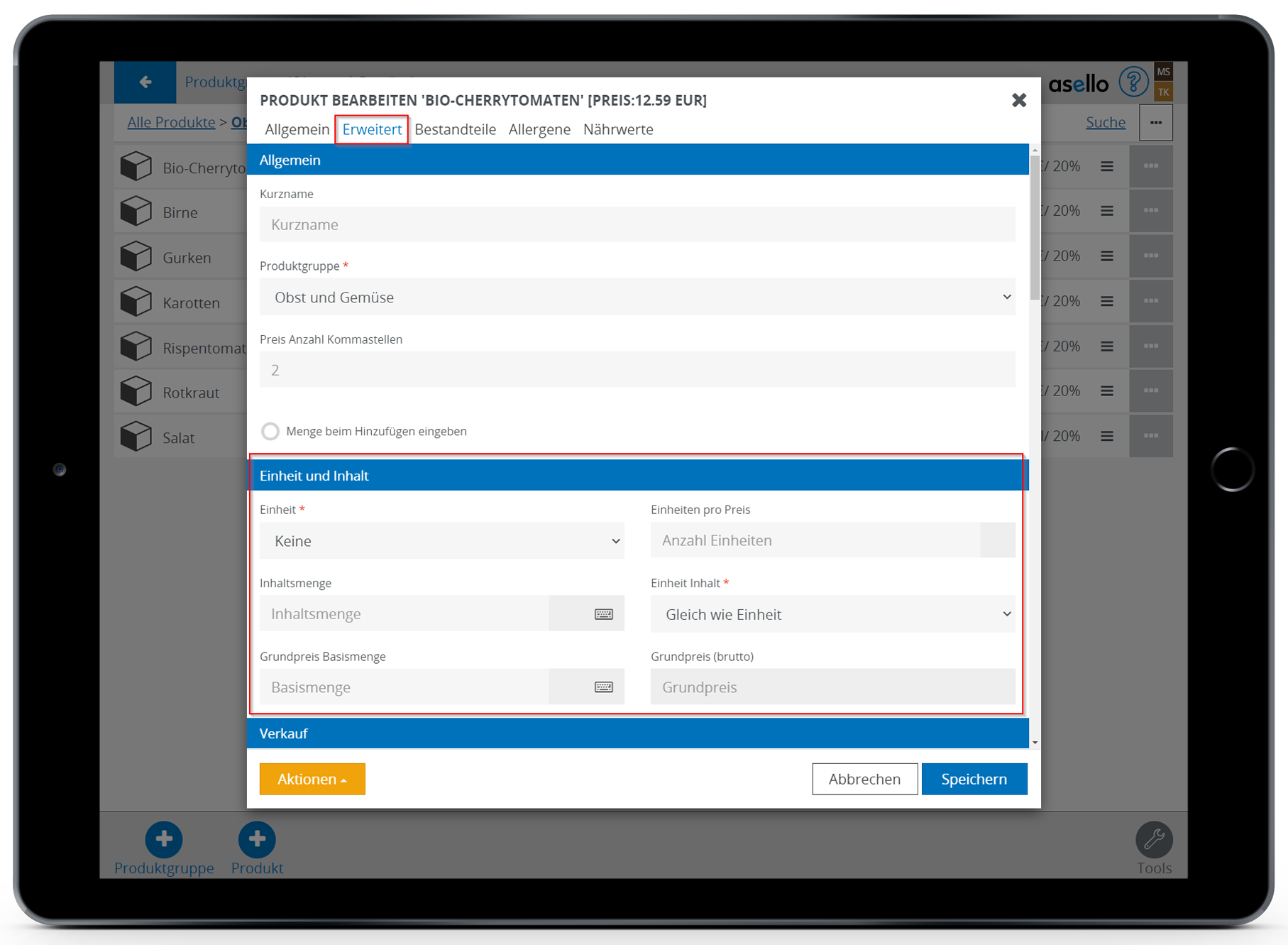 Sobald Sie mit Ihren Preiseinstellungen zufrieden sind, navigieren Sie unter dem Reiter "Erweitert" zu der Kategorie "Einheiten und Inhalt".