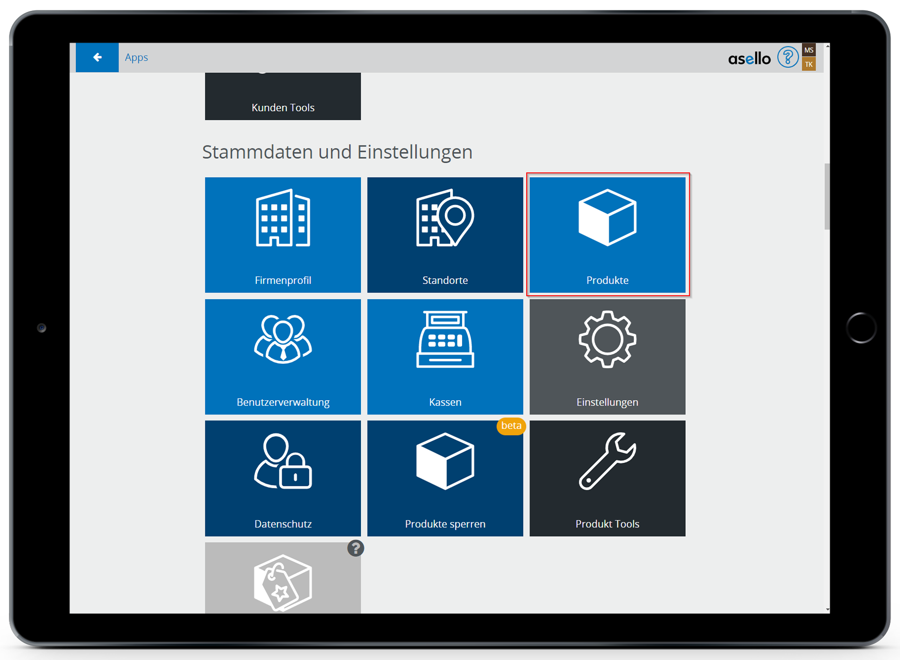Navigieren Sie unter der Kategorie "Stammdaten und Einstellungen" zu dem Punkt "Produkte" und öffnen Sie diesen.