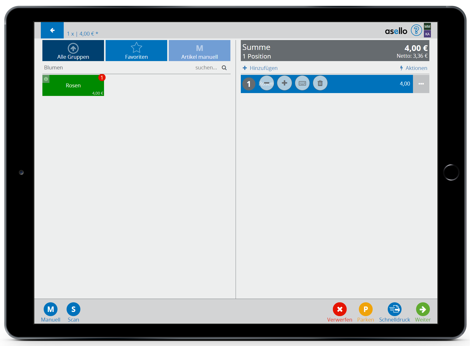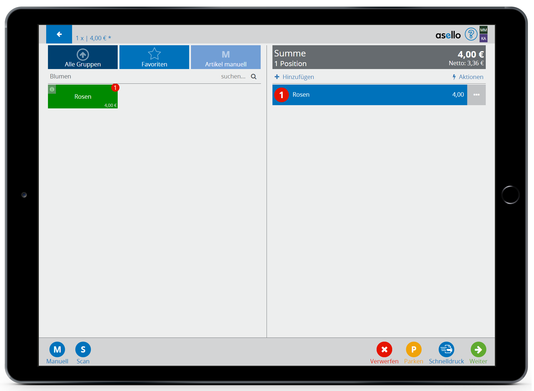 Auf der linken Seite werden nun die Hauptgruppen (Produktgruppen) angezeigt. Nach einem Klick auf eine Produktgruppe werden die Produkte dieser Gruppe angezeigt. Mit einem Klick auf das Produkt wird es als Position der aktuellen Rechnung hinzugefügt und erscheint rechts. Um wieder zu den Hauptgruppen zu kommen, klicken Sie auf den Button „Alle Gruppen“.