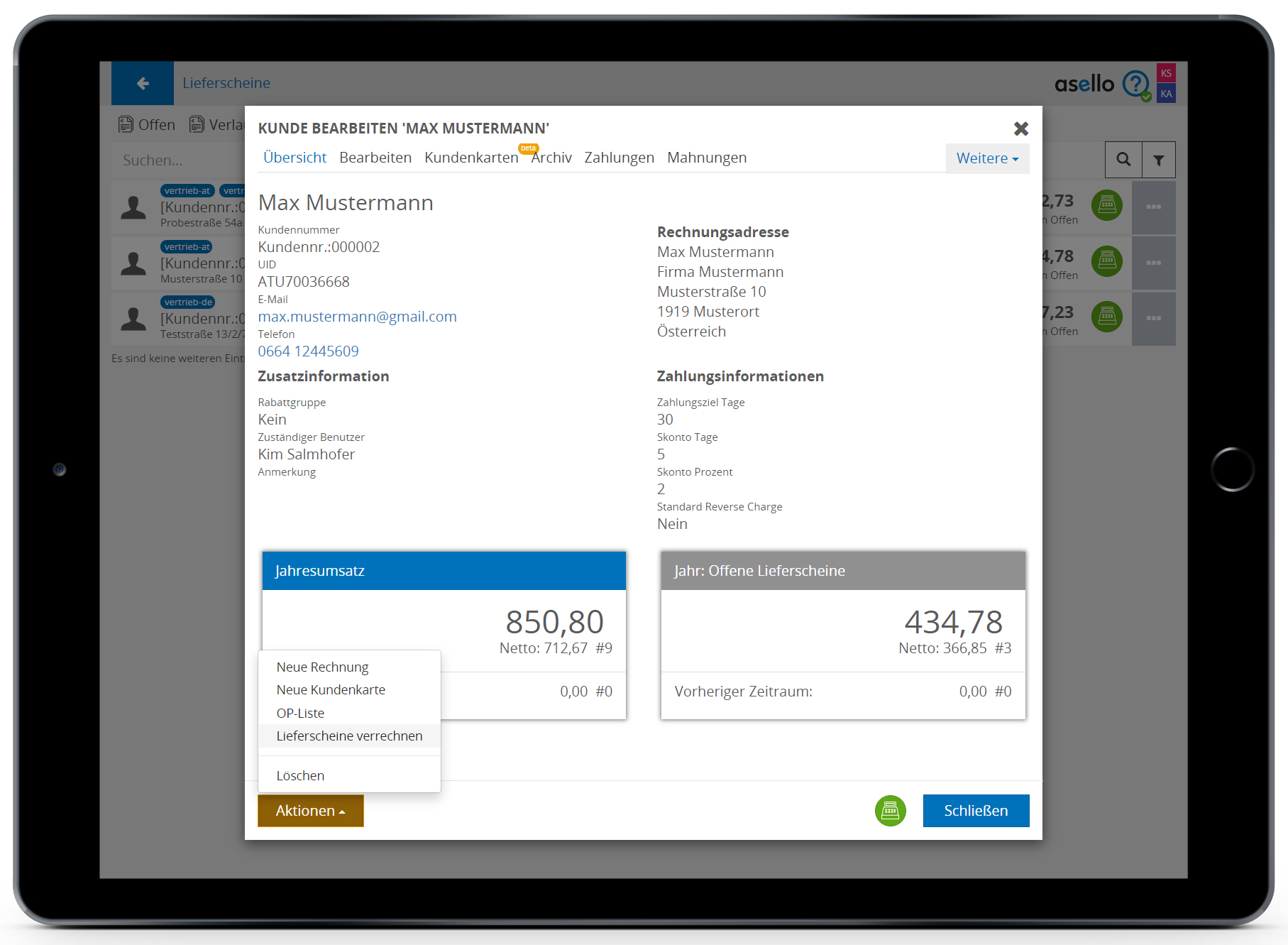 Um die offenen Lieferscheine eines Kunden zu verrechnen und so eine Sammelrechnung zu erstellen, klicken Sie auf den Kunden, den Sie verrechnen möchten. Anschließend öffnet sich ein Pop-Up-Fenster mit den Kundendetails.