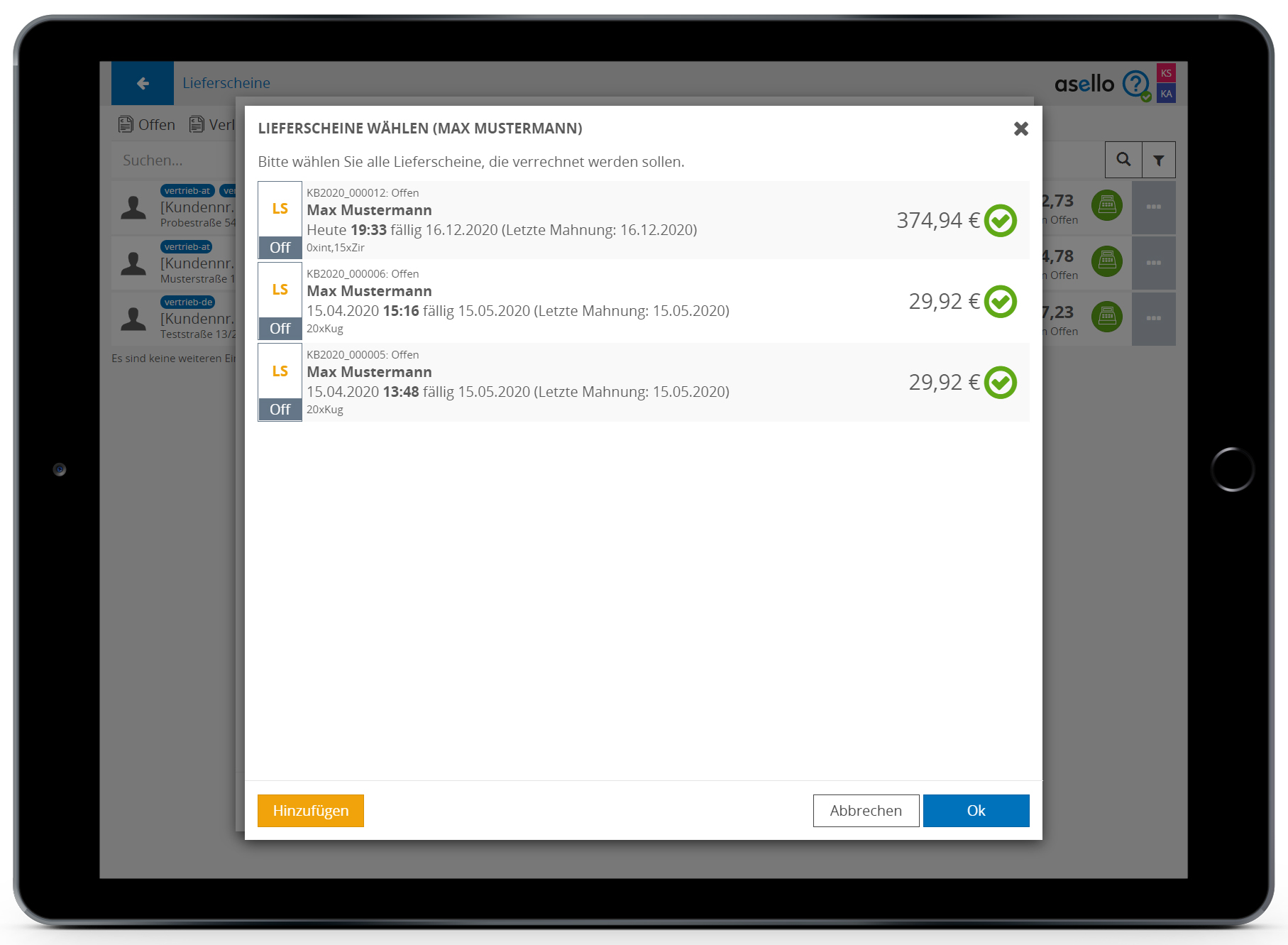 Nun erscheint ein weiteres Pop-Up-Fenster, in dem Sie die offenen Lieferscheine des Kunden sehen und durch setzten eines grünen Häkchens diese zur Sammelrechnung hinzufügen können. Standardmäßig sind alle offenen Lieferscheine ausgewählt. Anschließend klicken Sie auf den blauen Button „OK" im rechten unteren Eck.
