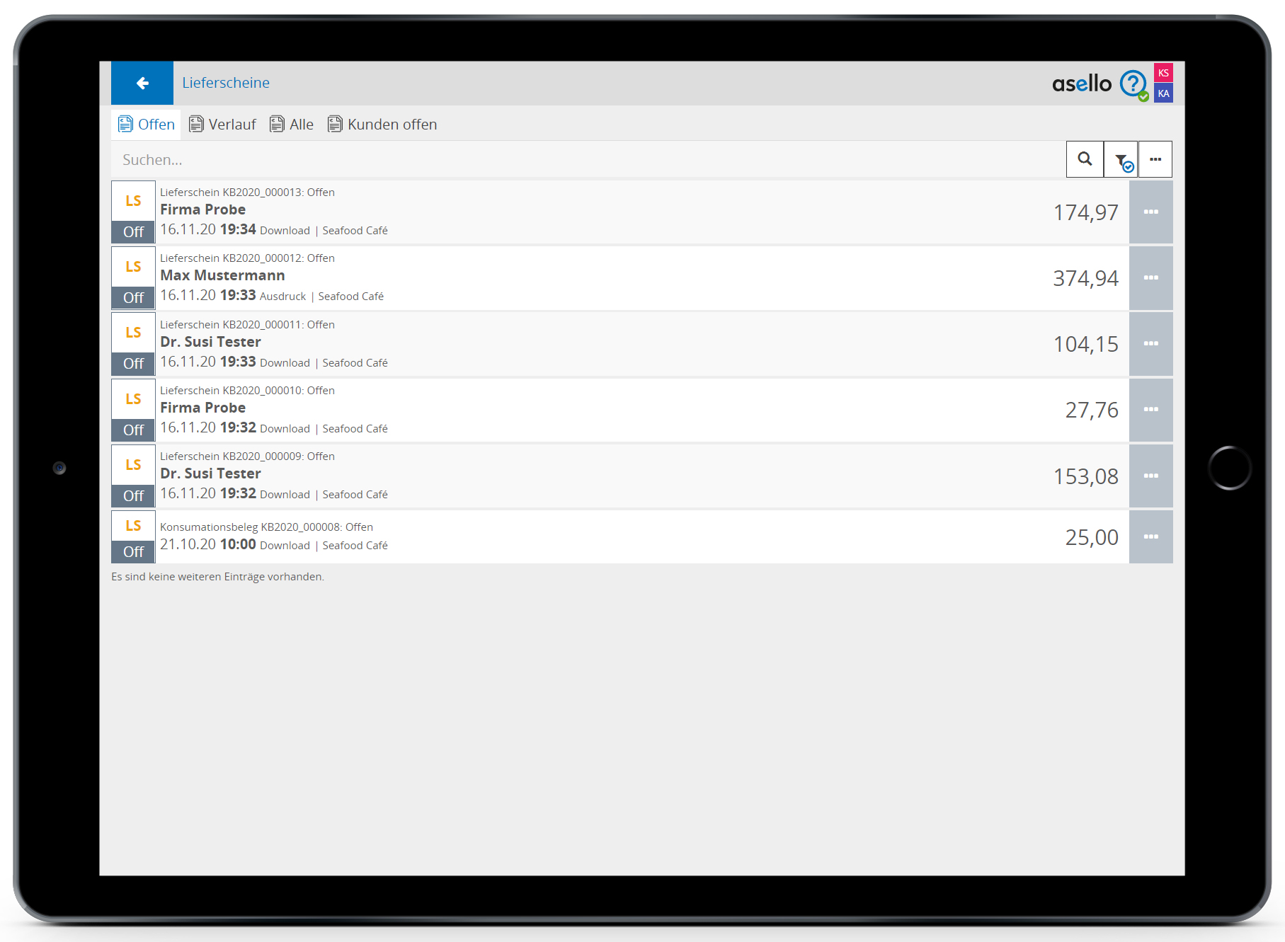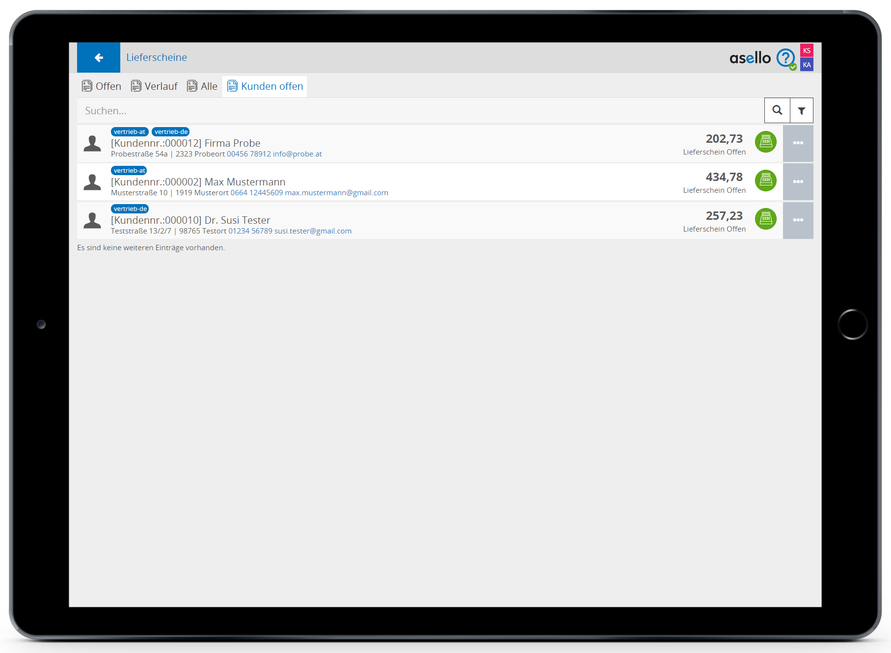 Unter dem Reiter „Kunden offen" finden Sie alle Kunden aufgelistet, bei denen Lieferscheine noch nicht verrechnet wurden.
