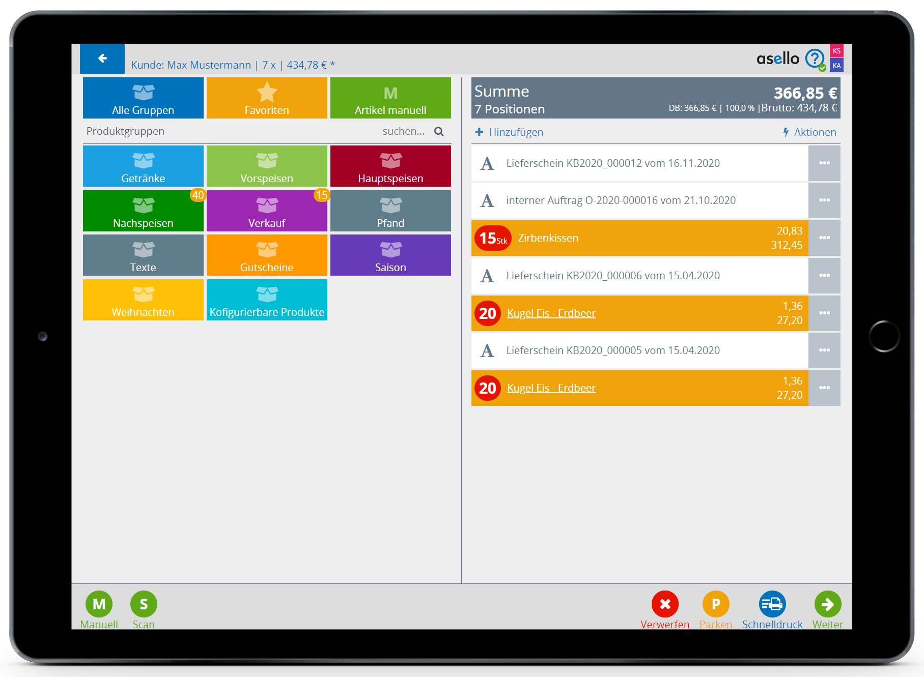Nun werden die Positionen der Lieferscheine und je Lieferschein ein Textbaustein mit den Lieferscheininformationen einer neuen Rechnung hinzugefügt. haben Sie haben in diesem Schritt die Möglichkeit die Produkte zu verändern oder weitere Positionen hinzuzufügen. Um aus den Lieferscheinen abschließend eine Rechnung zu erstellen, klicken Sie auf „Schnelldruck" im rechten unteren Eck oder fahren Sie mit dem Button „Weiter" im Rechnungslauf fort.