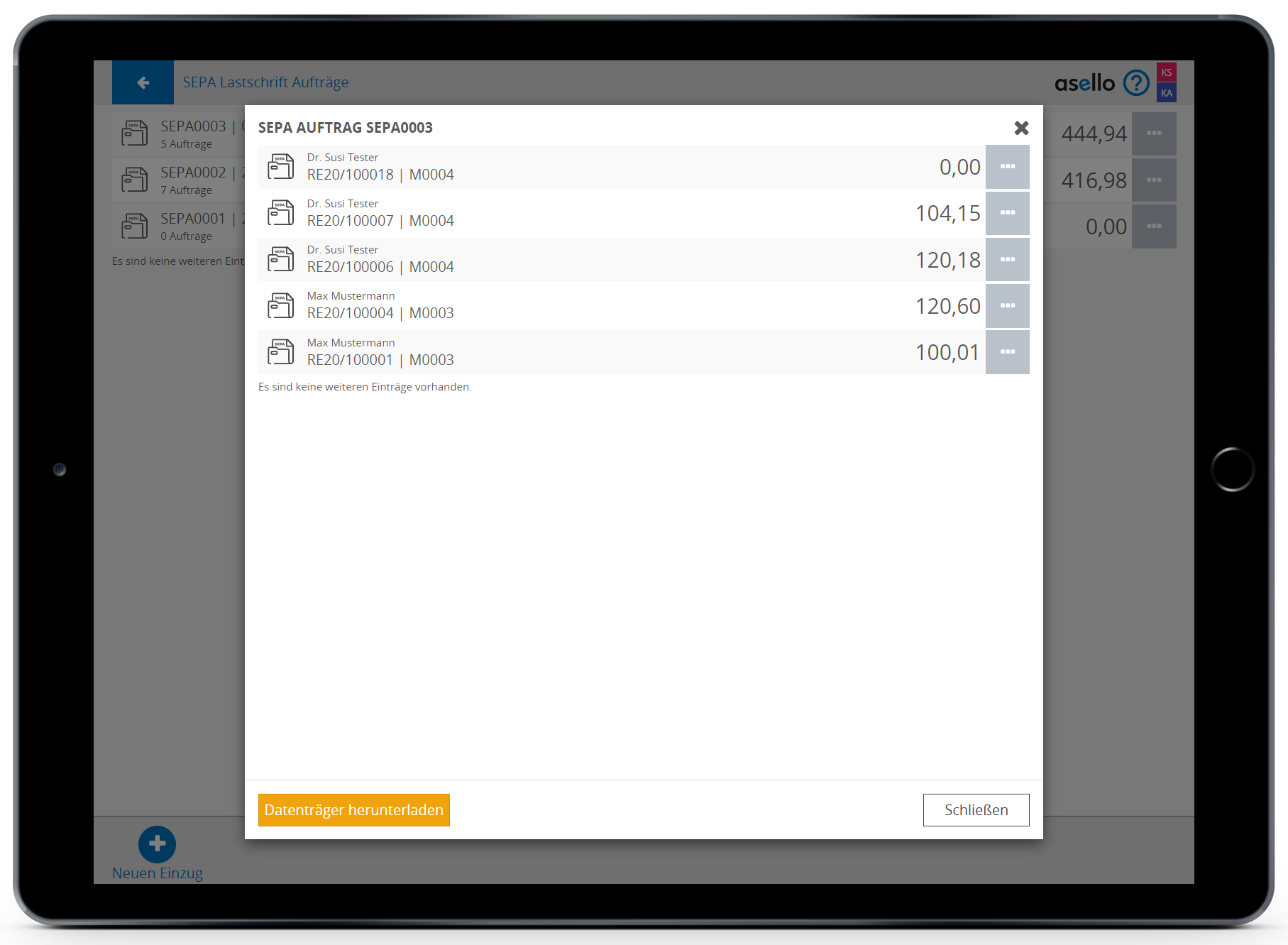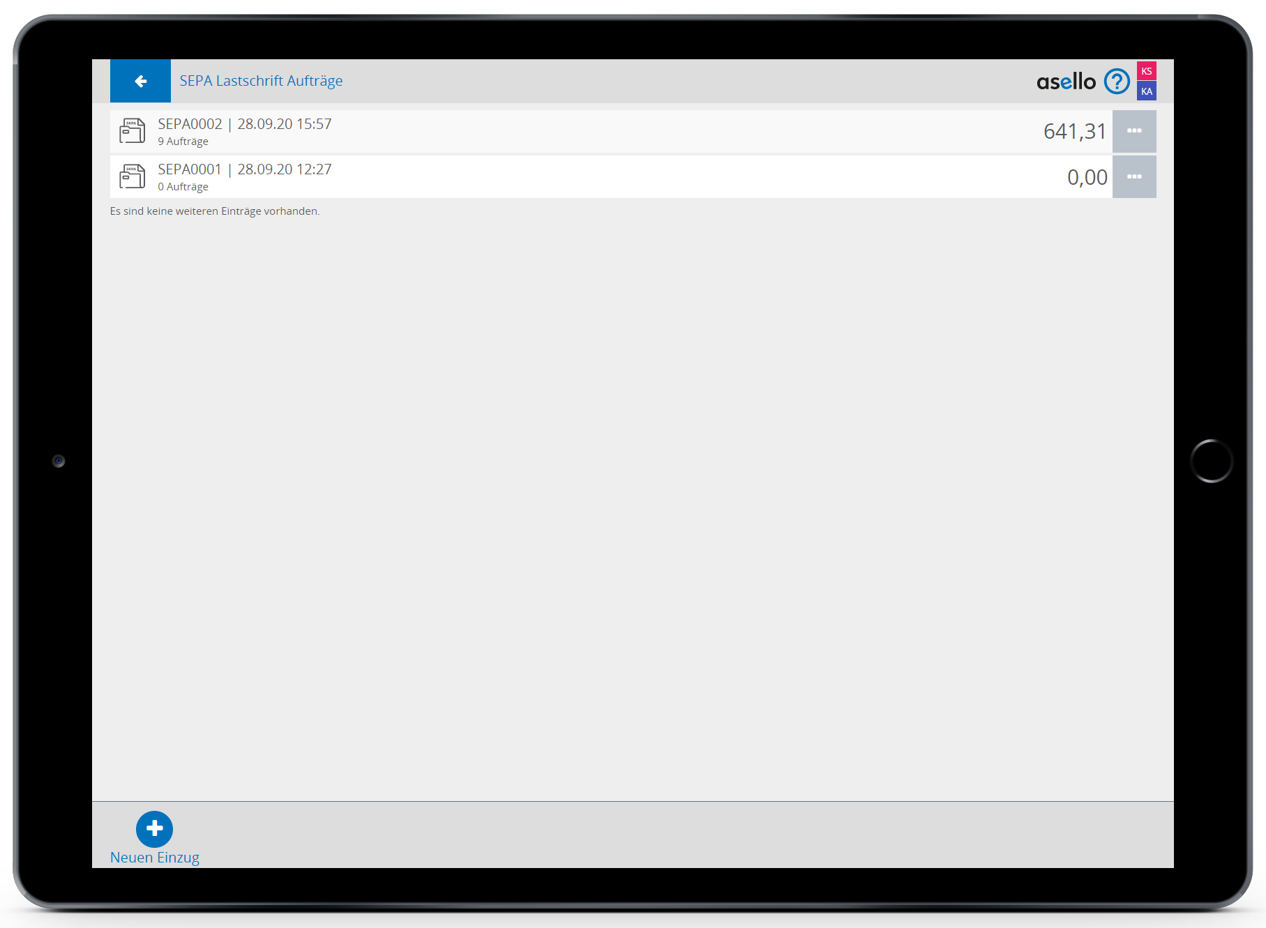 Haben Sie Ihren SEPA Lastschrift Auftrag mit den zu verrechnenden Zielrechnungen erstellt und möchten diesen abschließen, wählen Sie den Auftrag durch Klicken auf das Symbol mit den drei Punkten am Ende der Zeile aus.