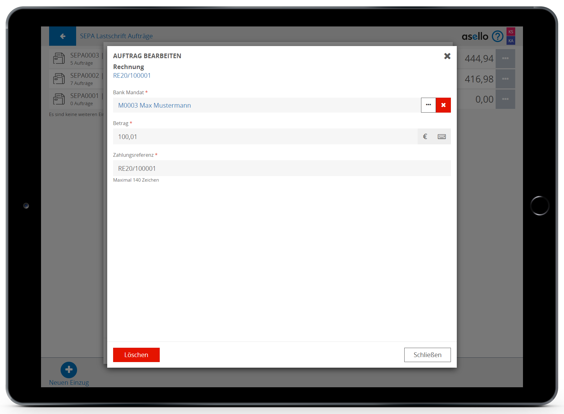 SEPA Lastschrift für diese Rechnung bereits vorhanden | Der Kunde verfügt über ein SEPA Lastschriftmandat und die Rechnung wurde mit der Zahlungsart Bankeinzug erstellt. Aber es gibt bereits einen SEPA Lastschrift Auftrag mit dieser Rechnung. Die Rechnung kann manuell hinzugefügt werden, wird dann aber bei beiden SEPA Lastschrift Aufträgen verrechnet. |