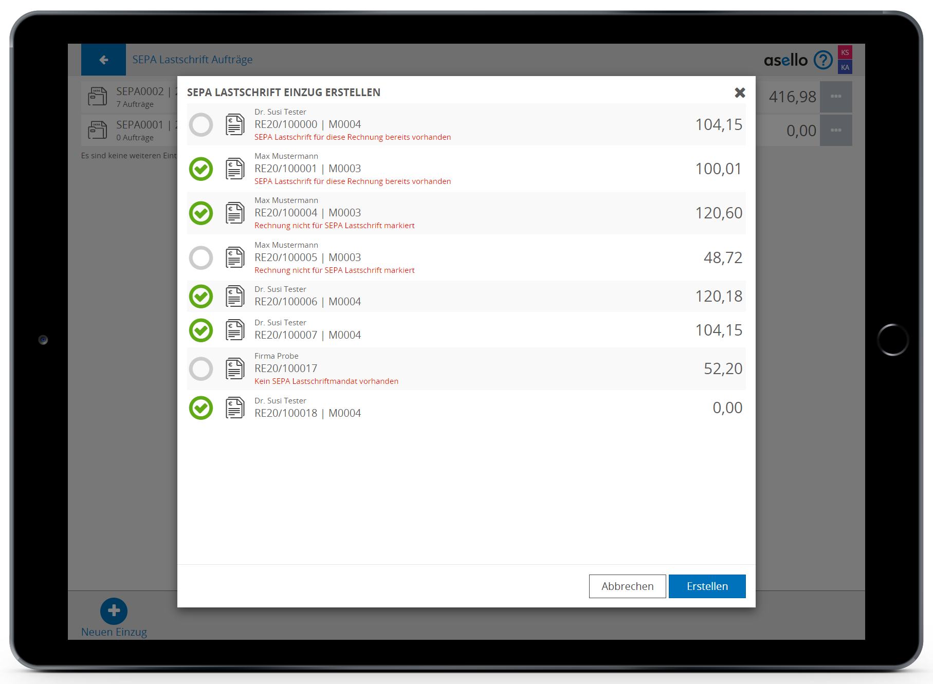 Klicken Sie auf das blaue Plus-Symbol „Neuen Einzug“ im linken unteren Eck, um einen neuen SEPA Lastschrift Einzug zu erstellen. Es öffnet sich ein Fenster mit allen offenen Zielrechnungen. Neue Rechnungen, die für eine Zahlung per Bankeinzug erstellt wurden und über ein SEPA Mandat verfügen, werden automatisch mit einem grünen Häkchen markiert. Wählen Sie alle Rechnungen aus, die Sie mit einem SEPA Lastschrift Einzug verrechnen möchten und klicken Sie auf den blauen Button „Erstellen“ rechts unten.