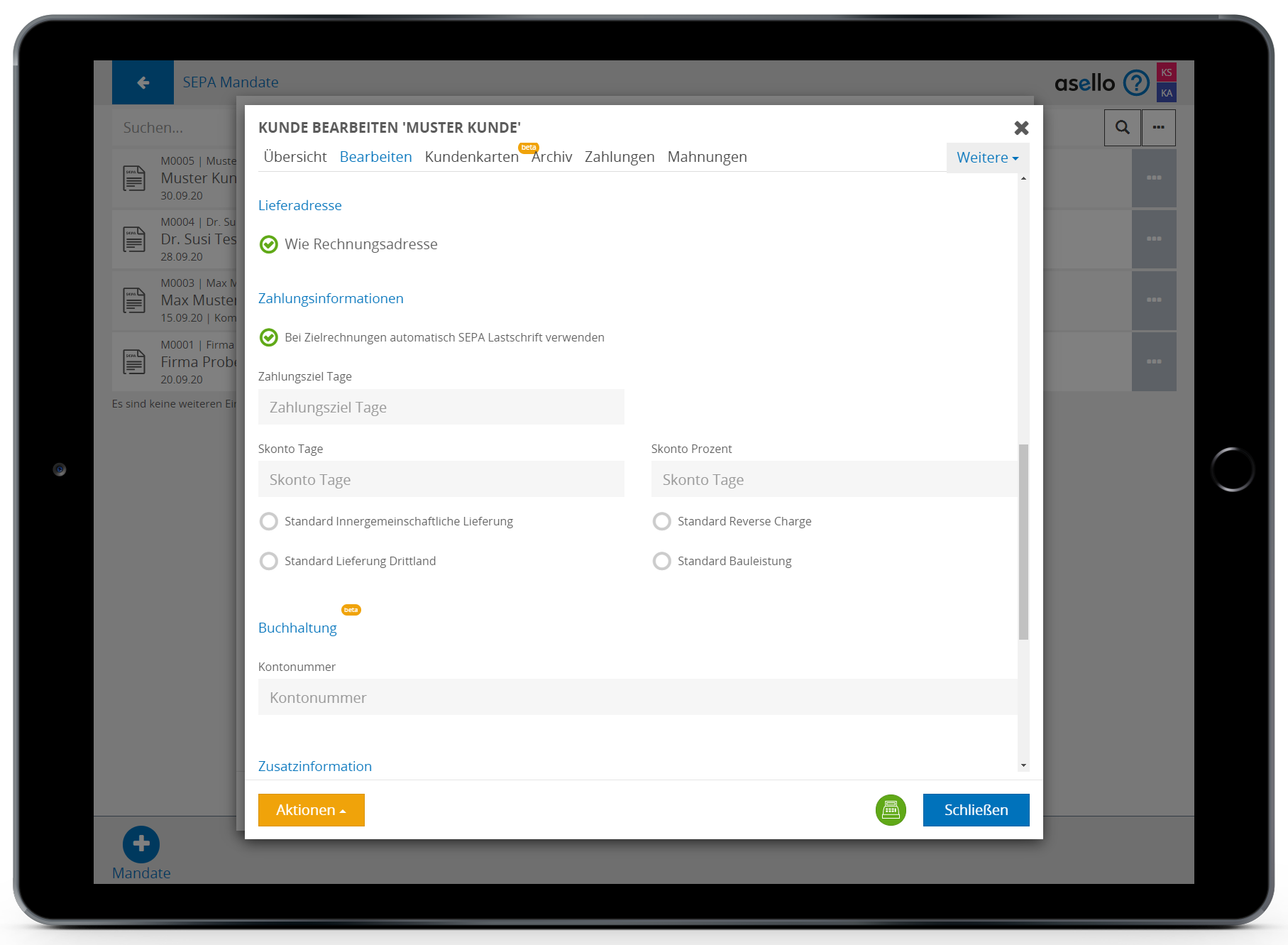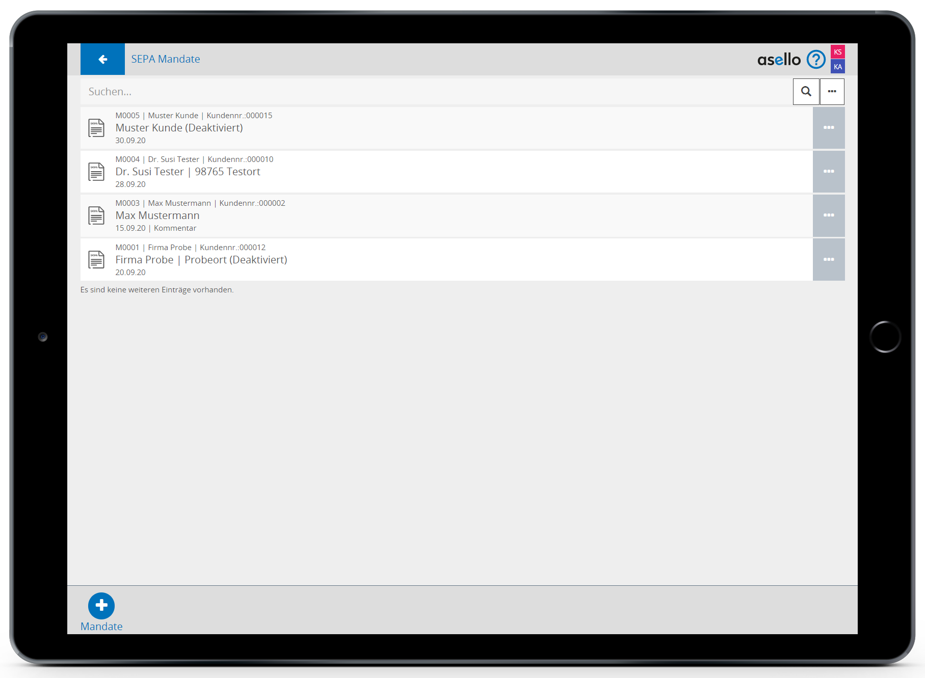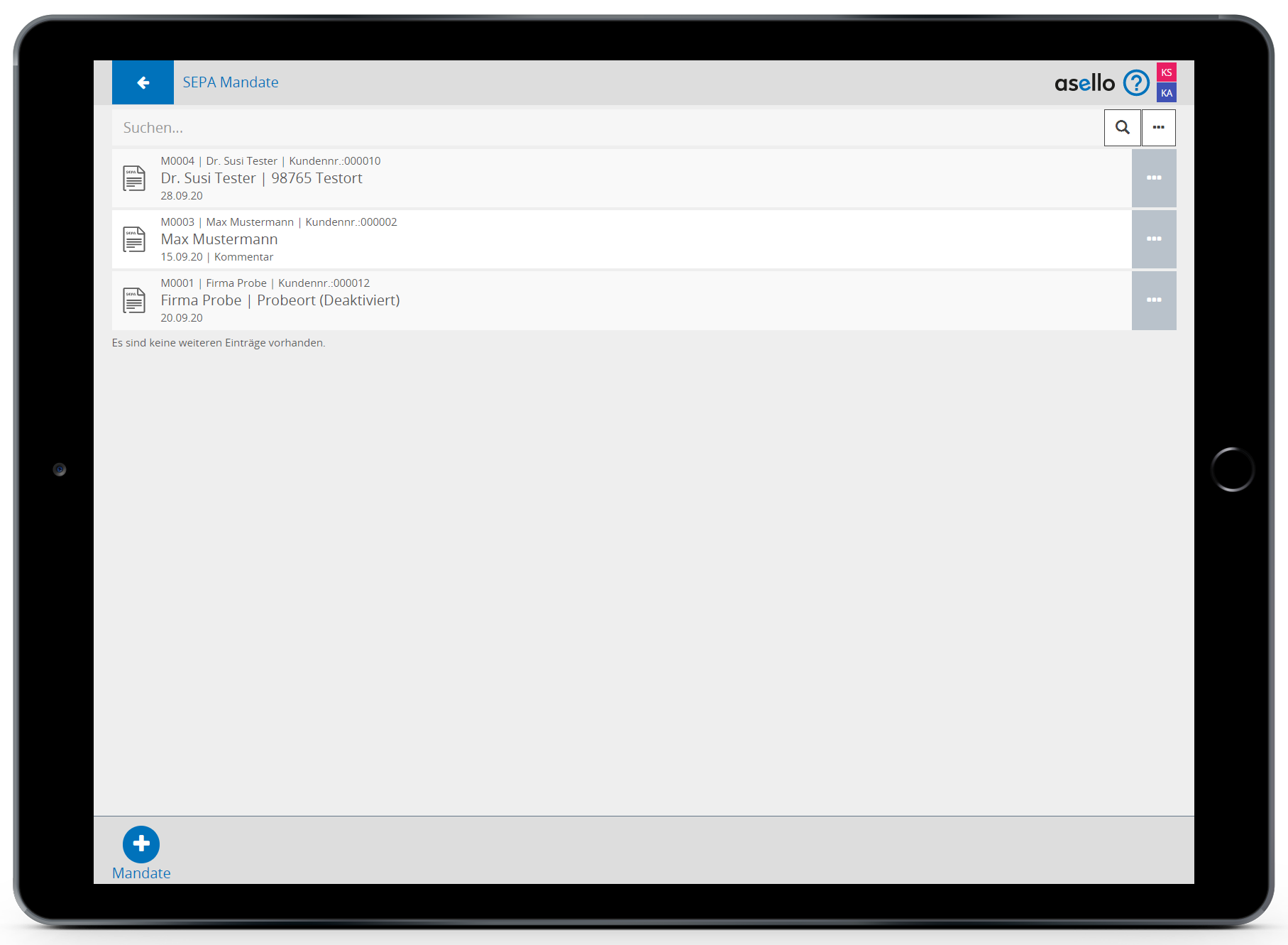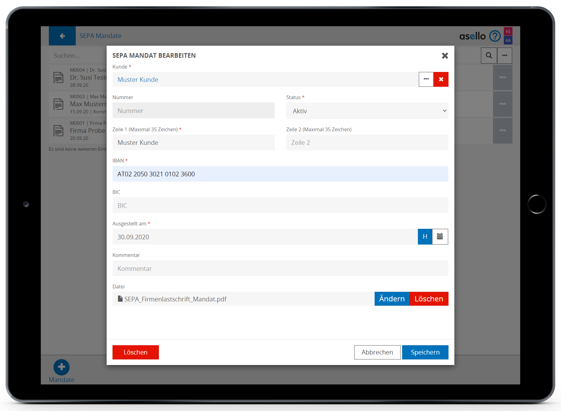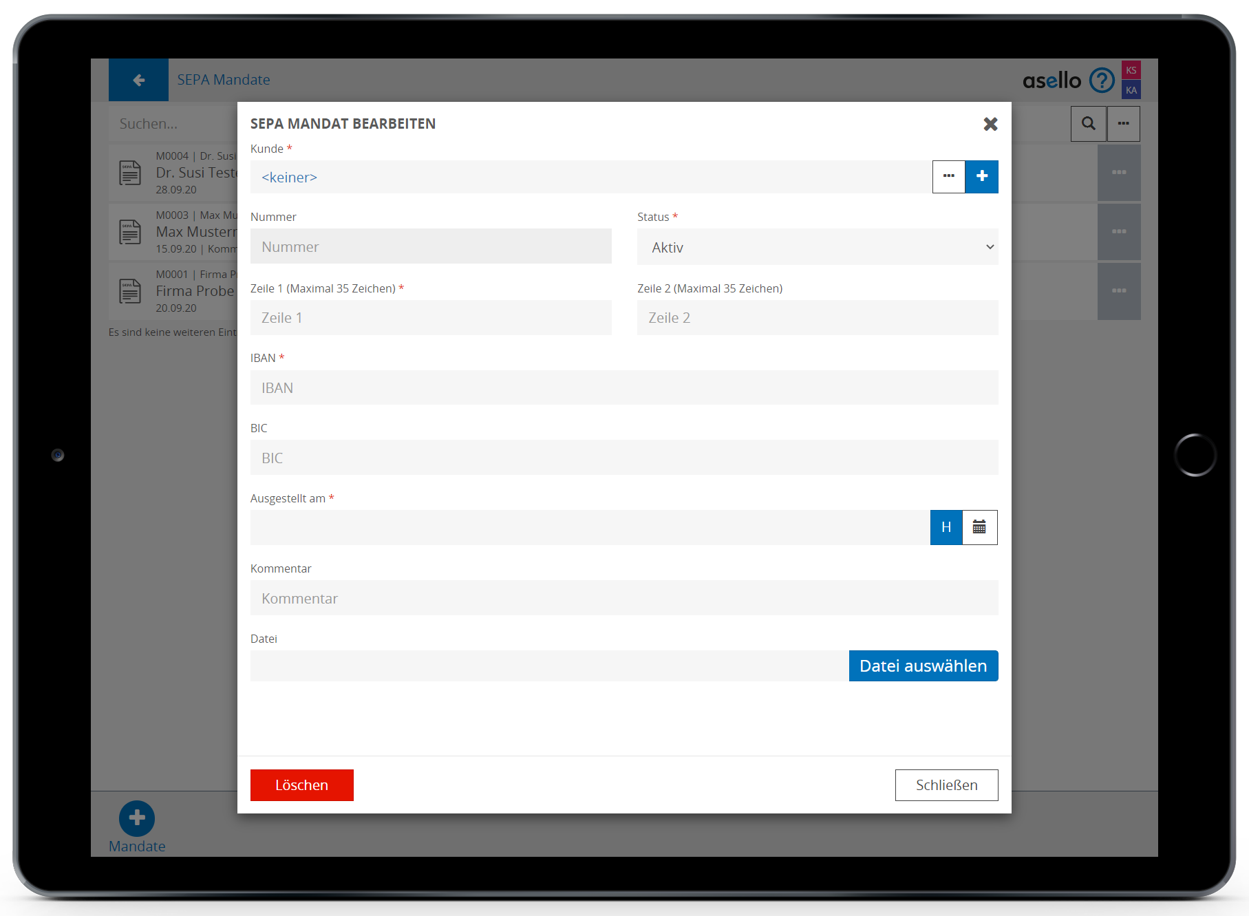 Die fortlaufende Mandatsnummer wird automatisch von asello vergeben.