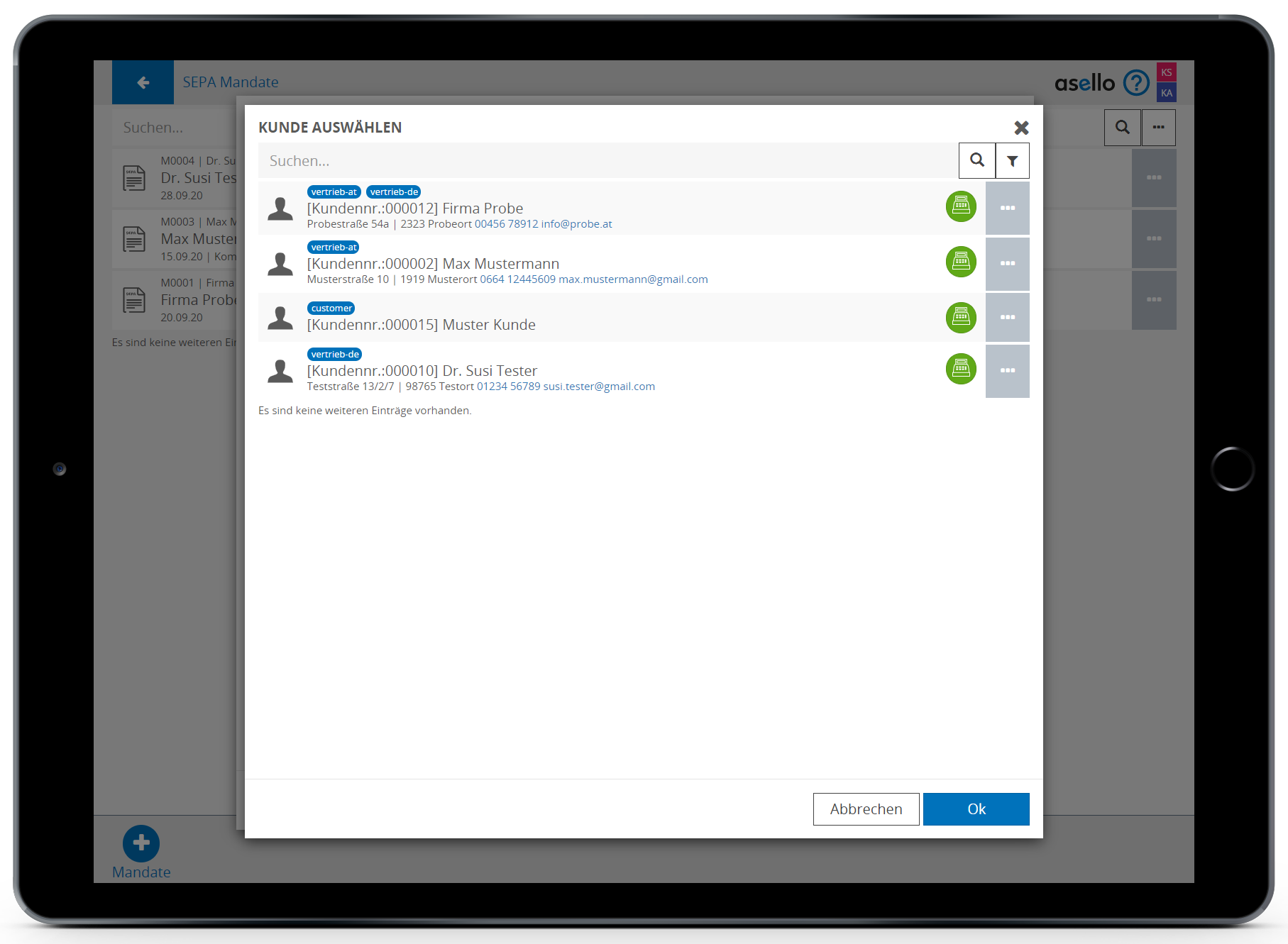 Sie können ein neues SEPA Mandat auch direkt bei Ihren Kunden erstellen. Öffnen Sie den Kunden und Klicken Sie rechts oben auf das graue Feld „Weitere“ und anschließend auf SEPA Mandate. Hier sehen Sie eine Liste aller SEPA Mandate, die bei diesem Kunden hinterlegt sind. Ein neues SEPA Mandat kann durch Klick auf das blaue Plus-Symbol im rechten unteren Eck erstellt werden.