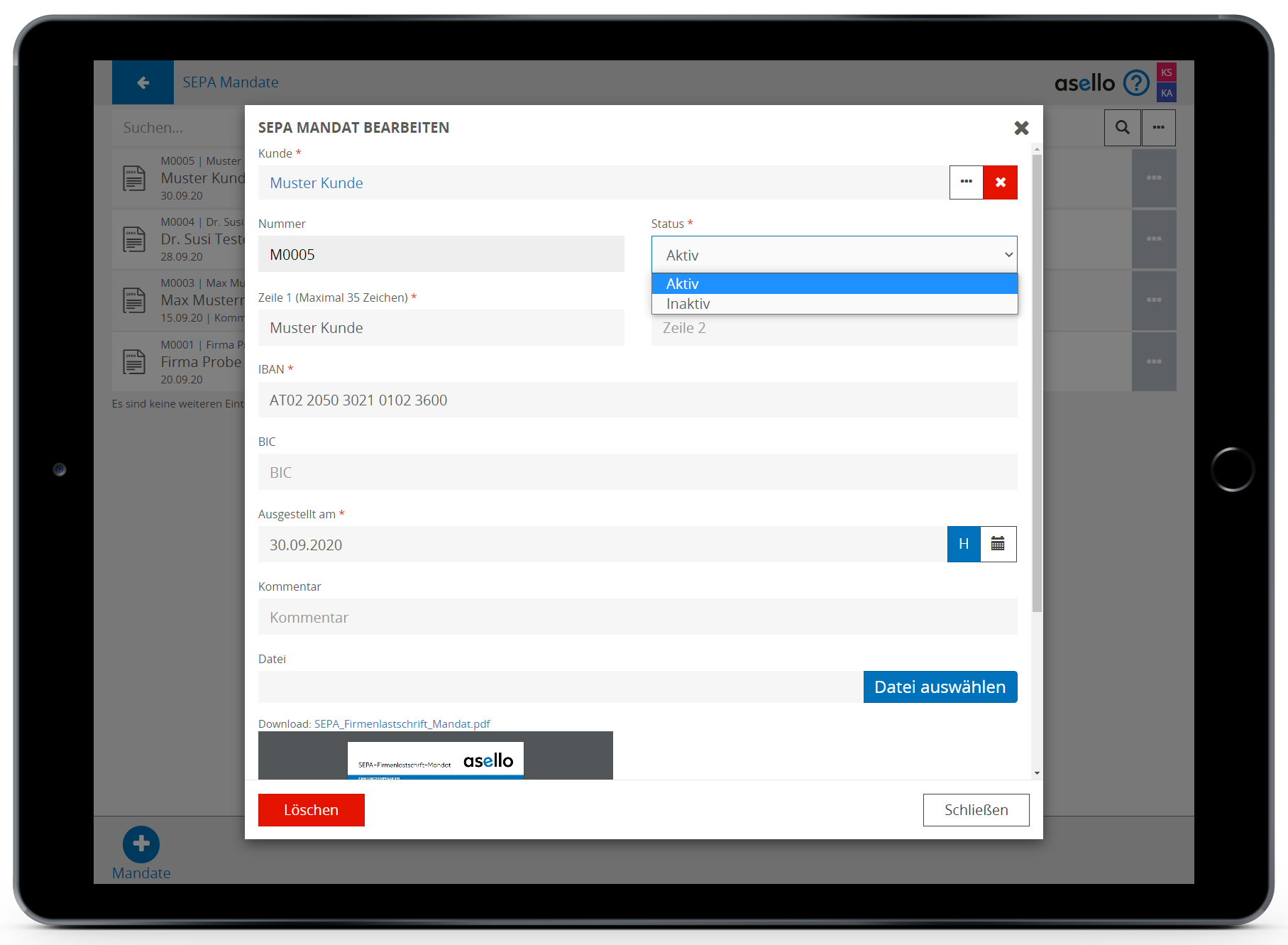Der Mandatsstatus ist bei einem neuen SEPA Lastschriftmandat auf „Aktiv“ voreingestellt. Sie können ein Mandat jederzeit inaktiv setzten, indem Sie das Mandat öffnen und den Status von „Aktiv“ auf „Inaktiv“ ändern. Das SEPA Mandat wird in der Liste mit dem Zusatz „Deaktiviert“ versehen.