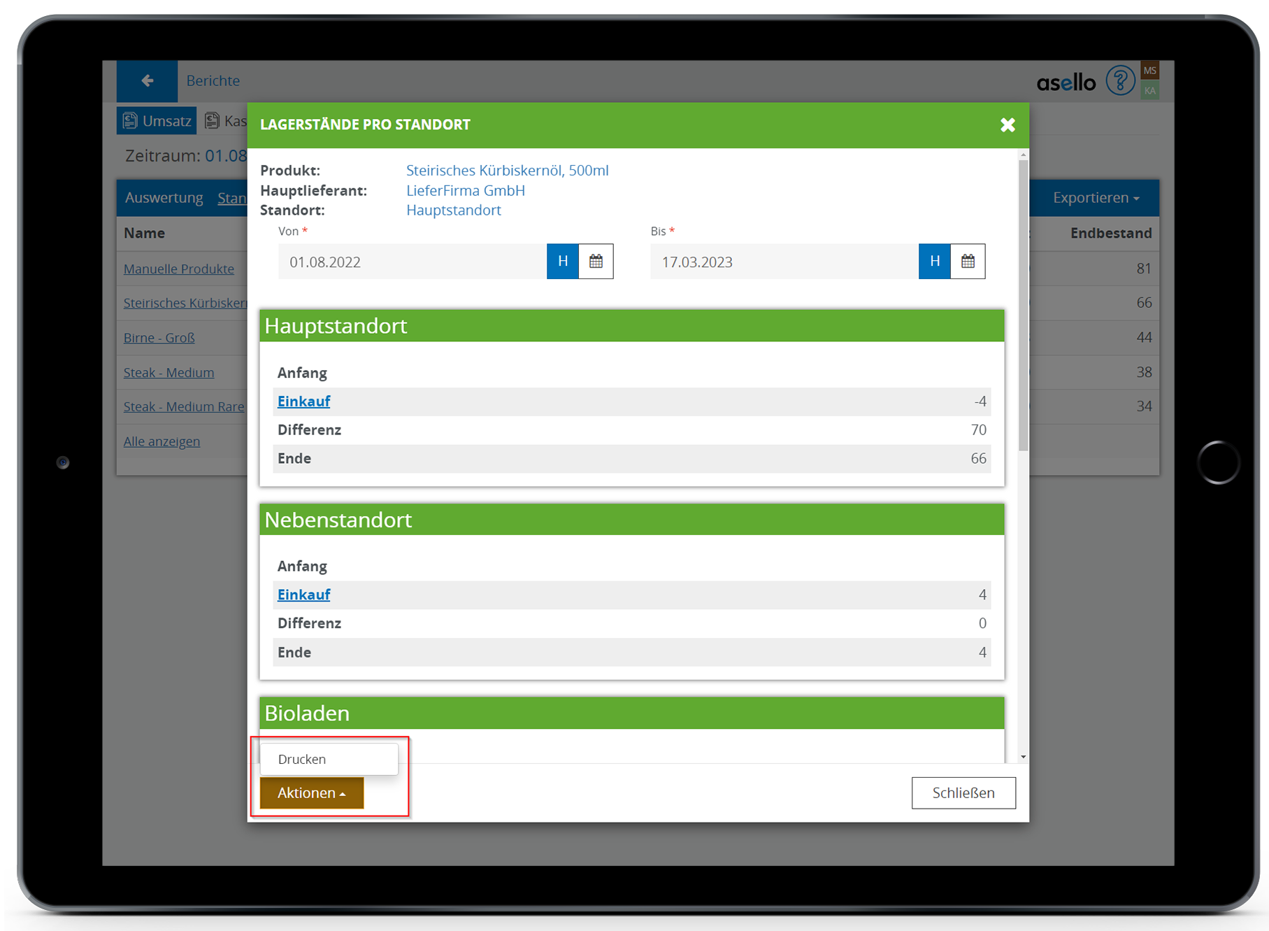 Mithilfe des Buttons "Aktionen" links unten kann dieser Bericht auch ausgedruckt werden.