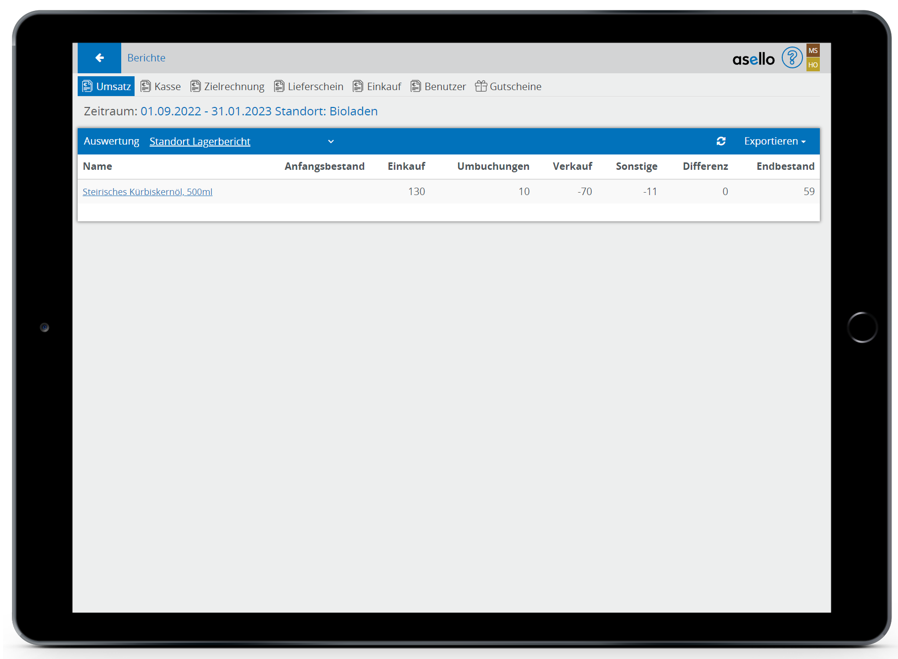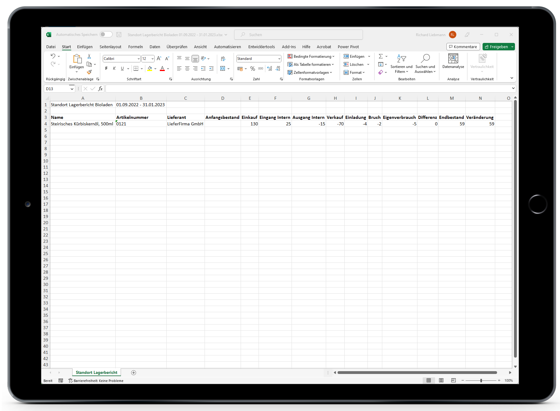 Der Anfangsbestand in unserem Beispiel ist 0, da die Lagerverwaltung erst im Zeitraum aktiviert wurde.