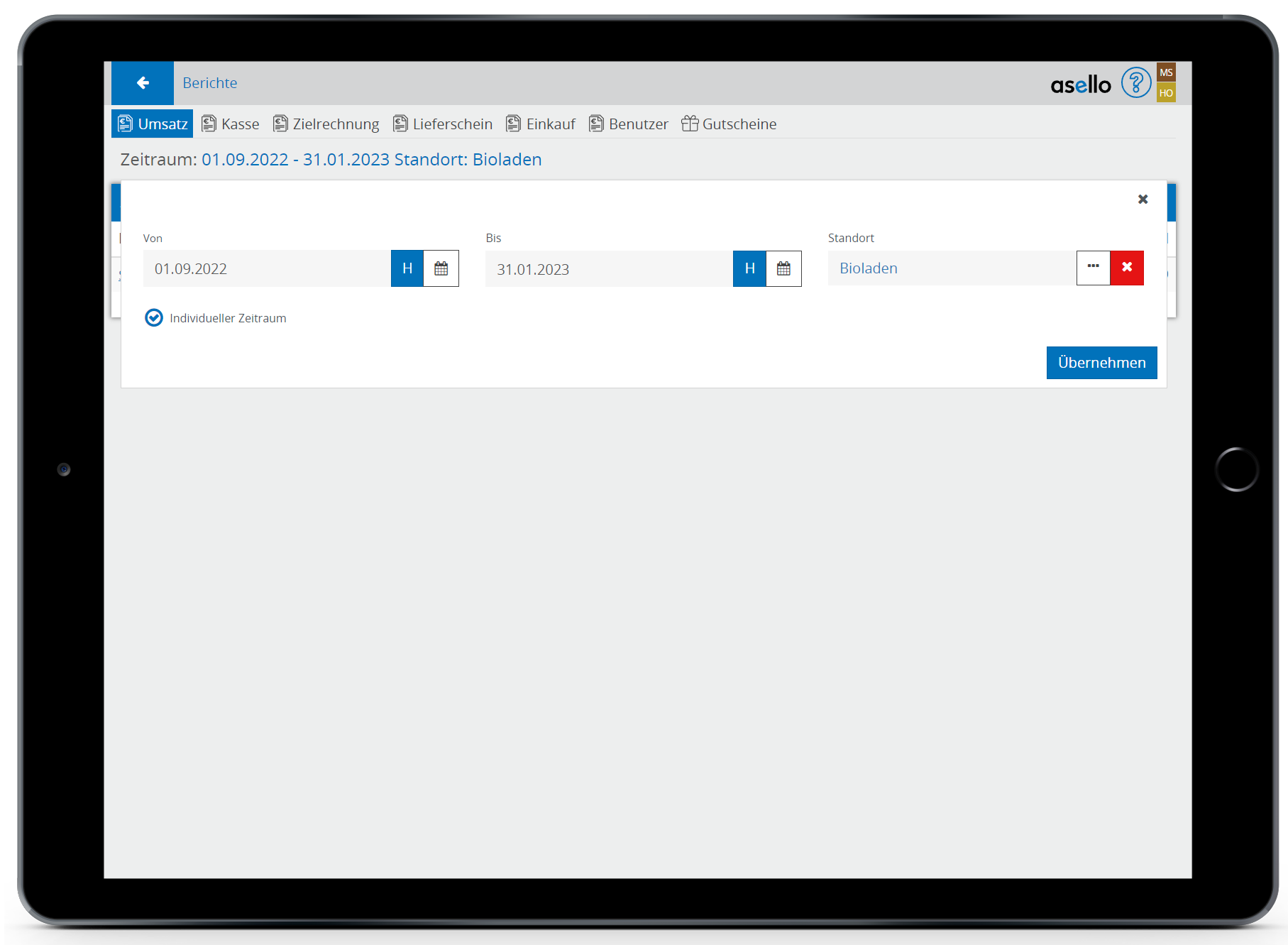Um den Bericht zu nutzen, muss unter Apps > Berichte, im Tab Umsatz der Zeitraum und ein Standort ausgewählt werden.