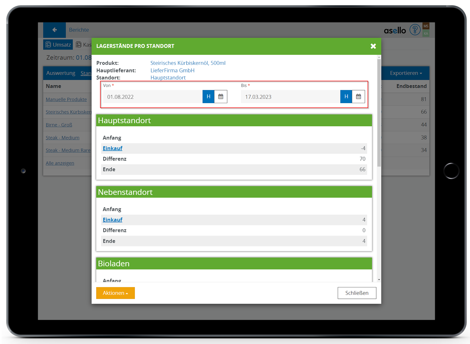 Endbestand | Soll-Endbestand zum Ende der Auswertung. Der Wert wird von der letzten Lagerbuchung, vor dem Ende-Datum entnommen. |