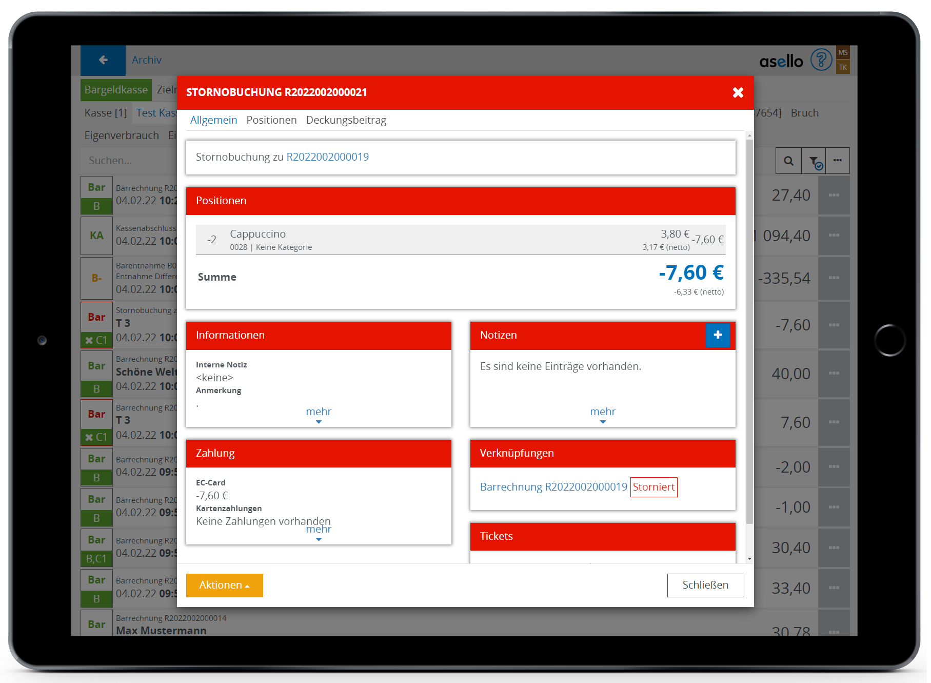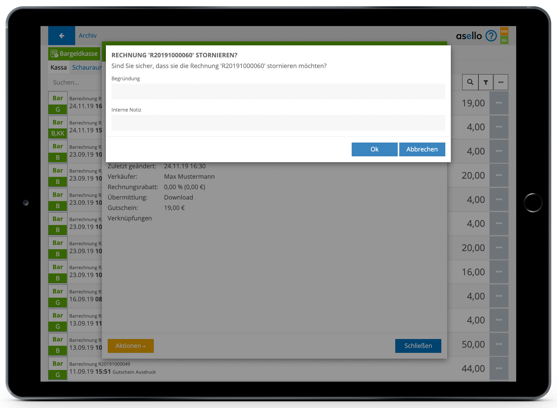 Mit dem Stornieren wird eine neue Rechnung, die Stornorechnung, erstellt, die die originale Rechnung aufhebt. Die Stornorechnung hat die gleichen Positionen wie die ursprüngliche Rechnung mit negierter Menge (Menge * -1).