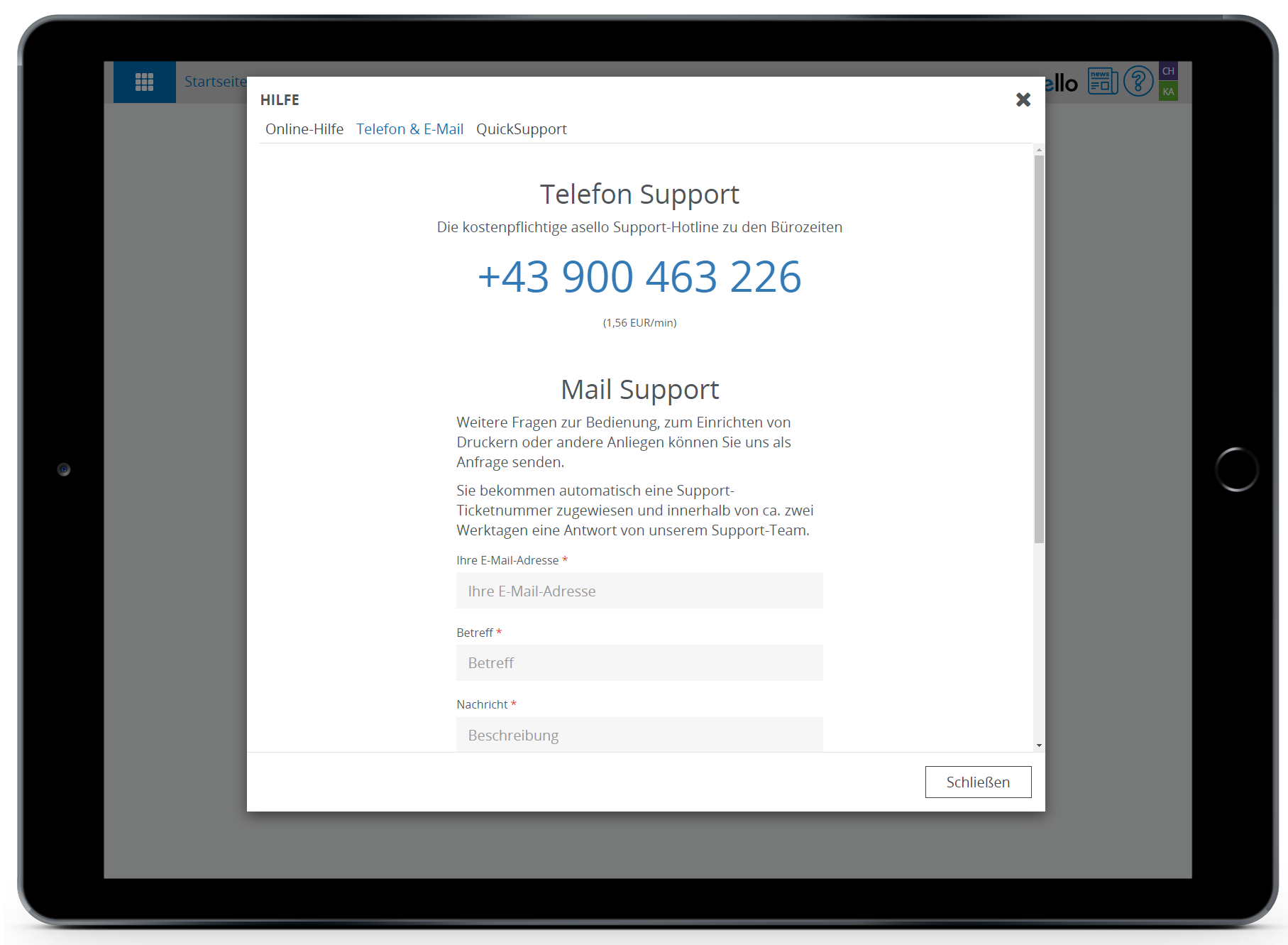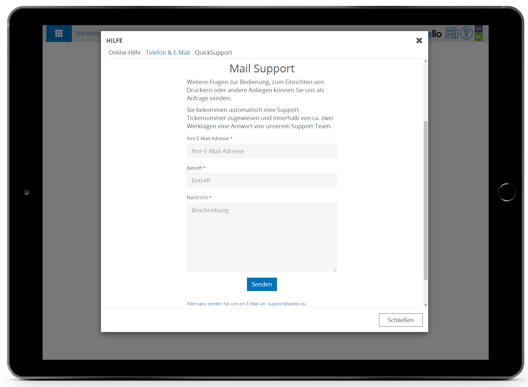Unter dem Fragezeichen in der Kopfzeile öffnet sich das Online Handbuch. Im zweiten Tab können Sie direkt Kontakt mit unserem Support Team aufnehmen. Geben Sie Ihre Emailadresse, den Betreff und die Nachricht ein und klicken SIe auf senden. Es wird direkt ein Supportticket erstellt. WIr bearbeiten Ihre Support Anfrage schnellstmöglich, meist innerhalb von 2 Werktagen. Sie können auch unseren kostenpflichtigen Telefonsupport unter der angezeigten Telefonnummer nutzen.