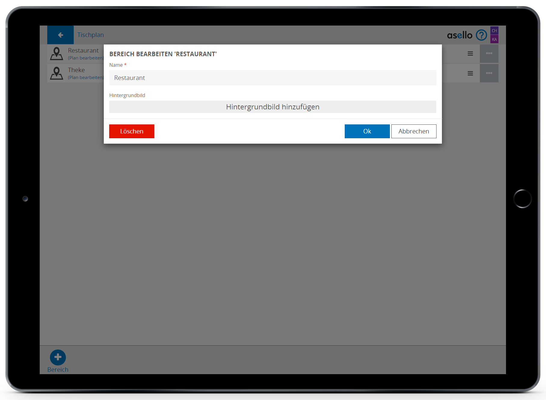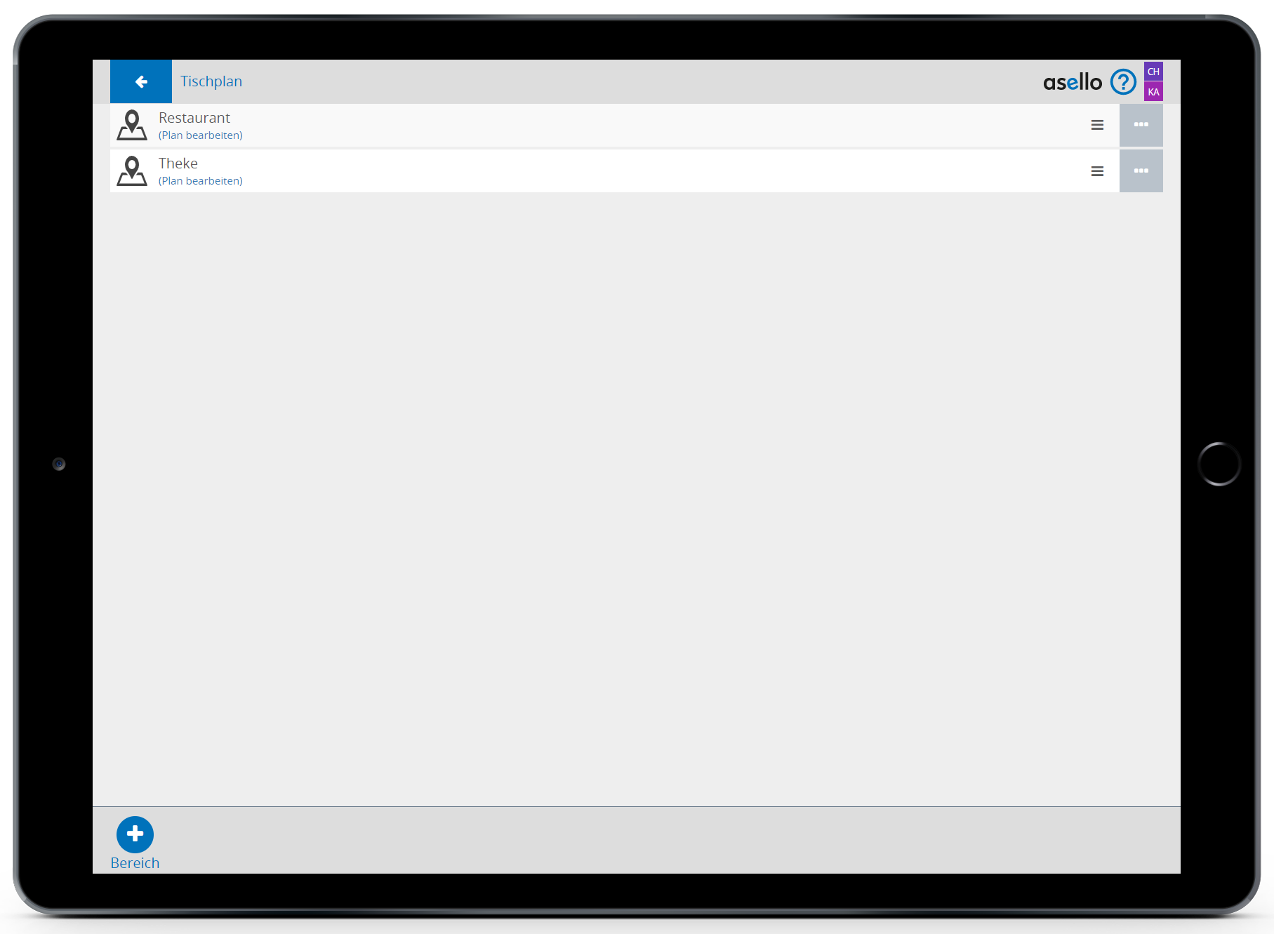 Bereiche dienen dazu, Ihr Lokal übersichtlicher zu gestalten. So können Sie Tischpläne für die Bar und für das Restaurant getrennt erstellen. Zuerst müssen Sie einen Bereich erstellen. Dazu klicken Sie auf das blaue Plus „Bereiche“ im linken unteren Eck. In diesem Fall nennen wir den Bereich "Restaurant". Um den Bereich abschließend zu erstellen, klicken Sie auf den blauen Button „OK“. Um einen Bereich umzubenennen oder zu löschen, klicken Sie auf das graue Viereck mit den drei weißen Punkten am Ende der jeweiligen Zeile. Um die Reihenfolge der Bereiche zu ändern, klicken Sie auf die drei grauen Striche am Ende der jeweiligen Zeile und ziehen Sie den Bereich an die Stelle wo Sie diesen haben möchten.