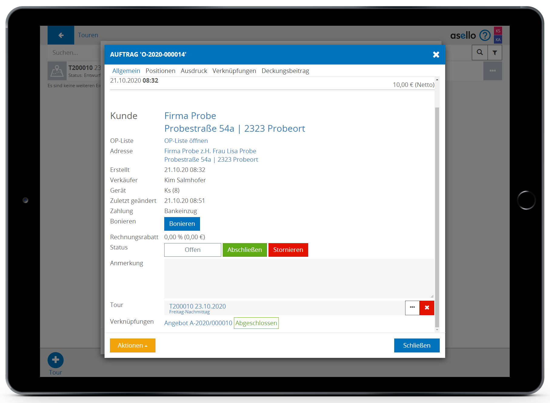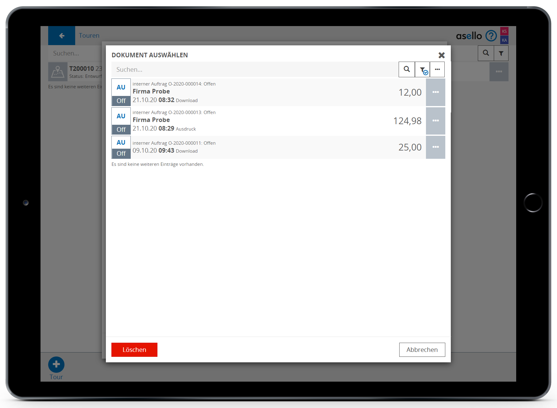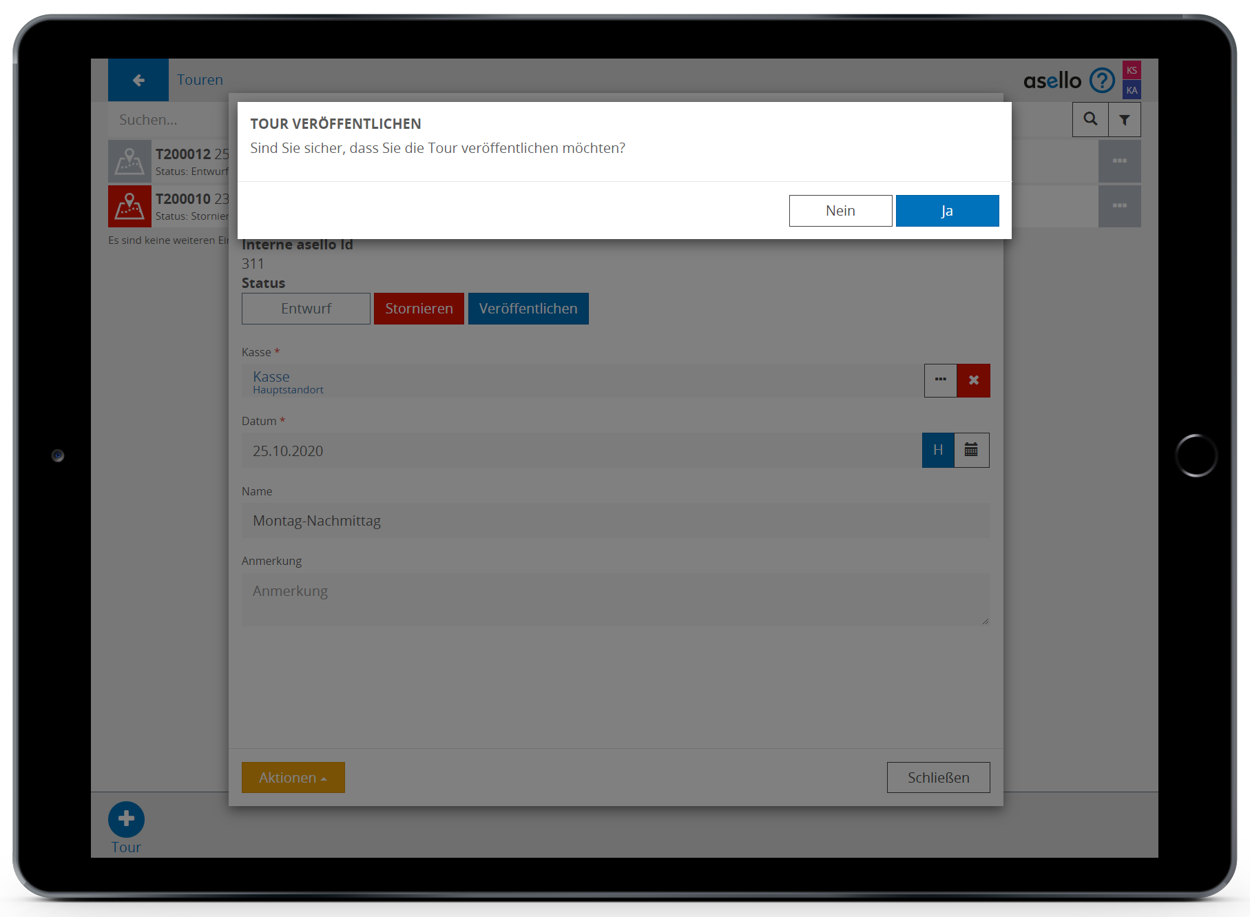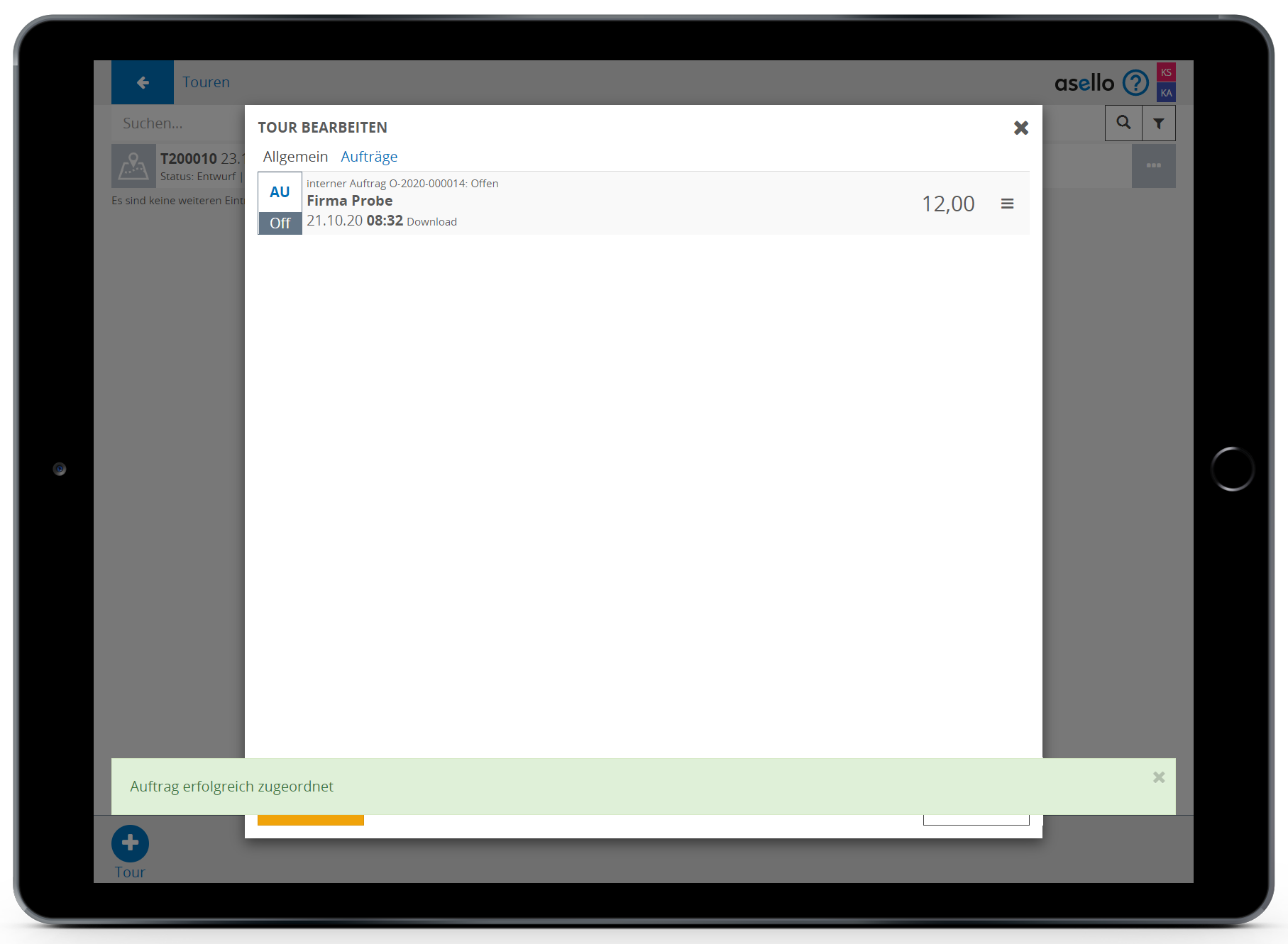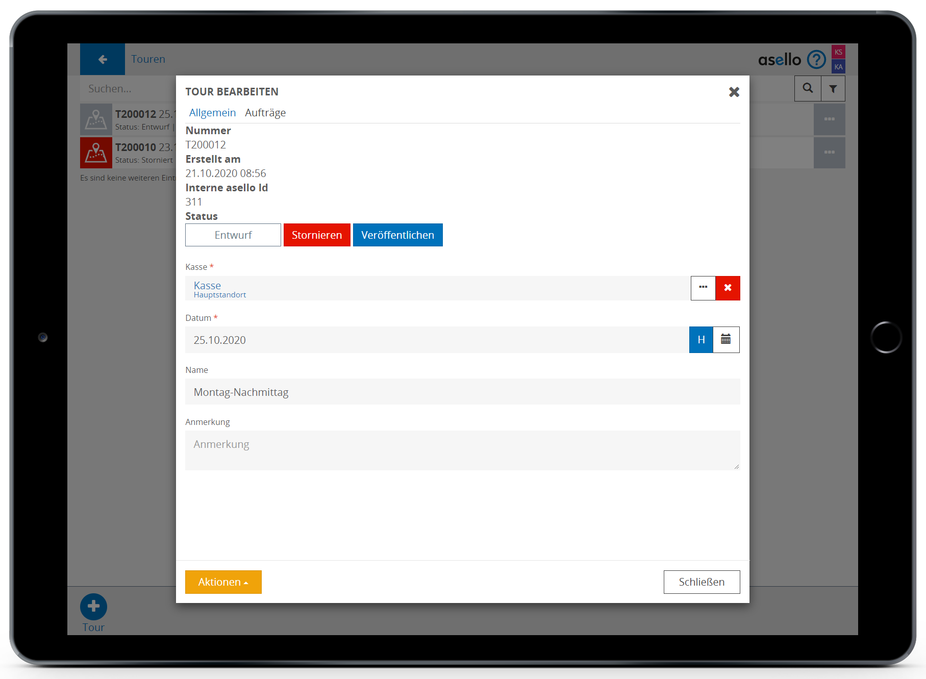 Die Aufträge, die der Tour zugewiesen waren, sind nun wieder für neue Touren verfügbar.