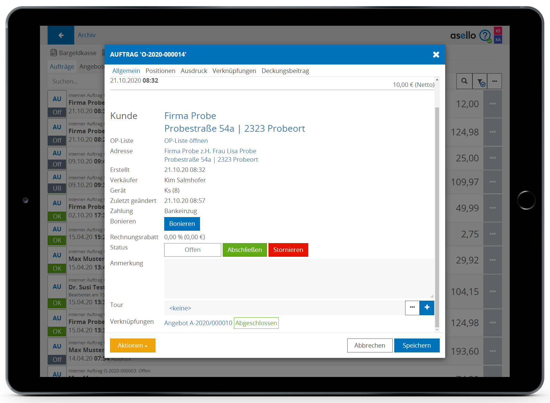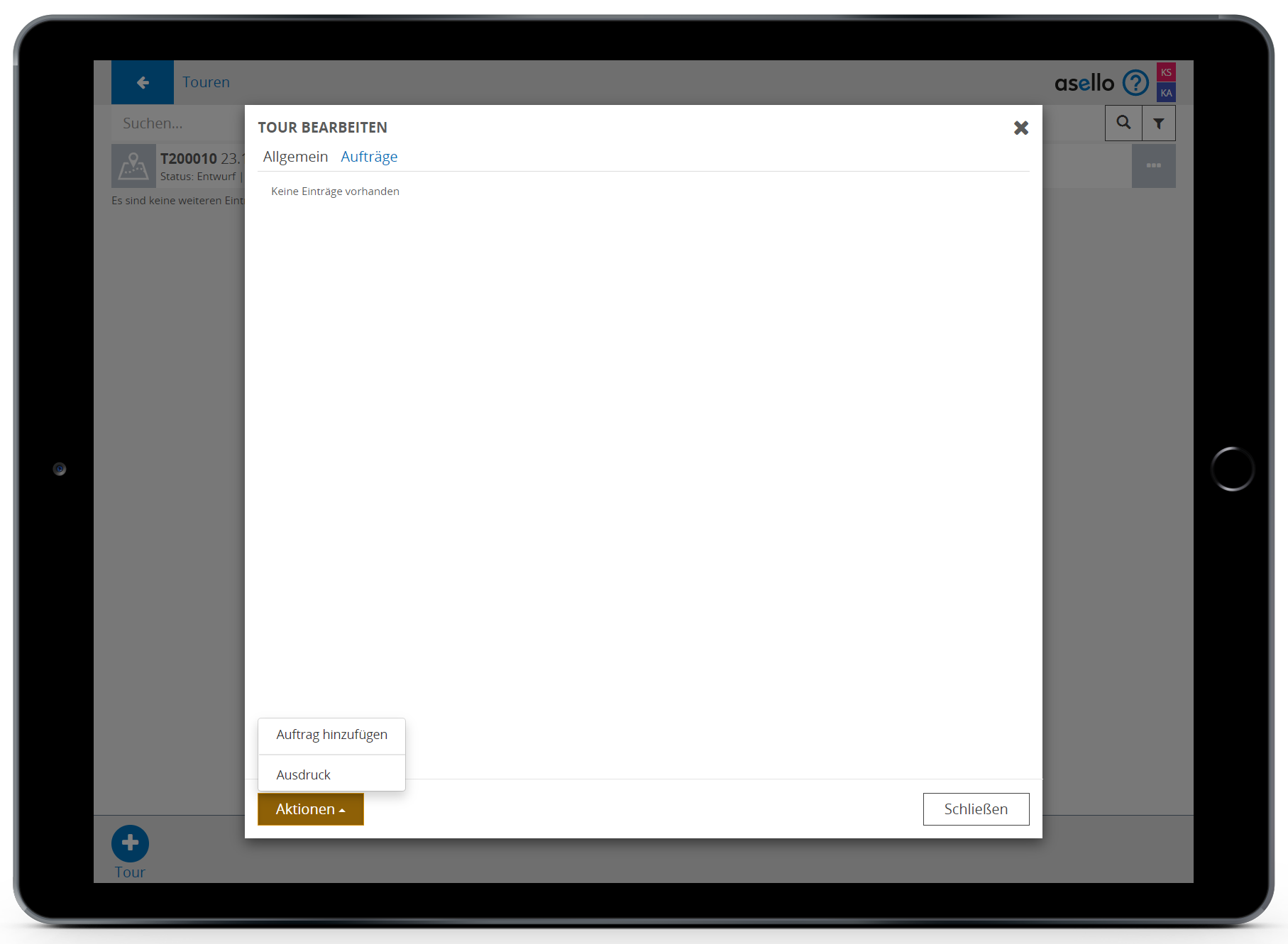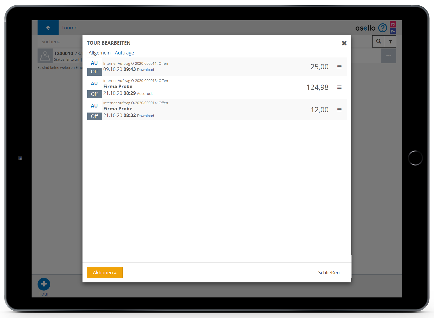 Um einen neuen Auftrag hinzuzufügen klicken Sie im linken unteren Eck auf den orangen Button „Aktionen“ und wählen Sie den Menüpunkt „Auftrag hinzufügen“. Es öffnet sich eine Übersicht Ihrer offenen Aufträge. Klicken Sie auf den Auftrag, den Sie der Tour hinzufügen möchten, oder klicken Sie auf das graue Symbol mit den drei Punkten am Ende der Zeile, um den Auftrag zu bearbeiten.