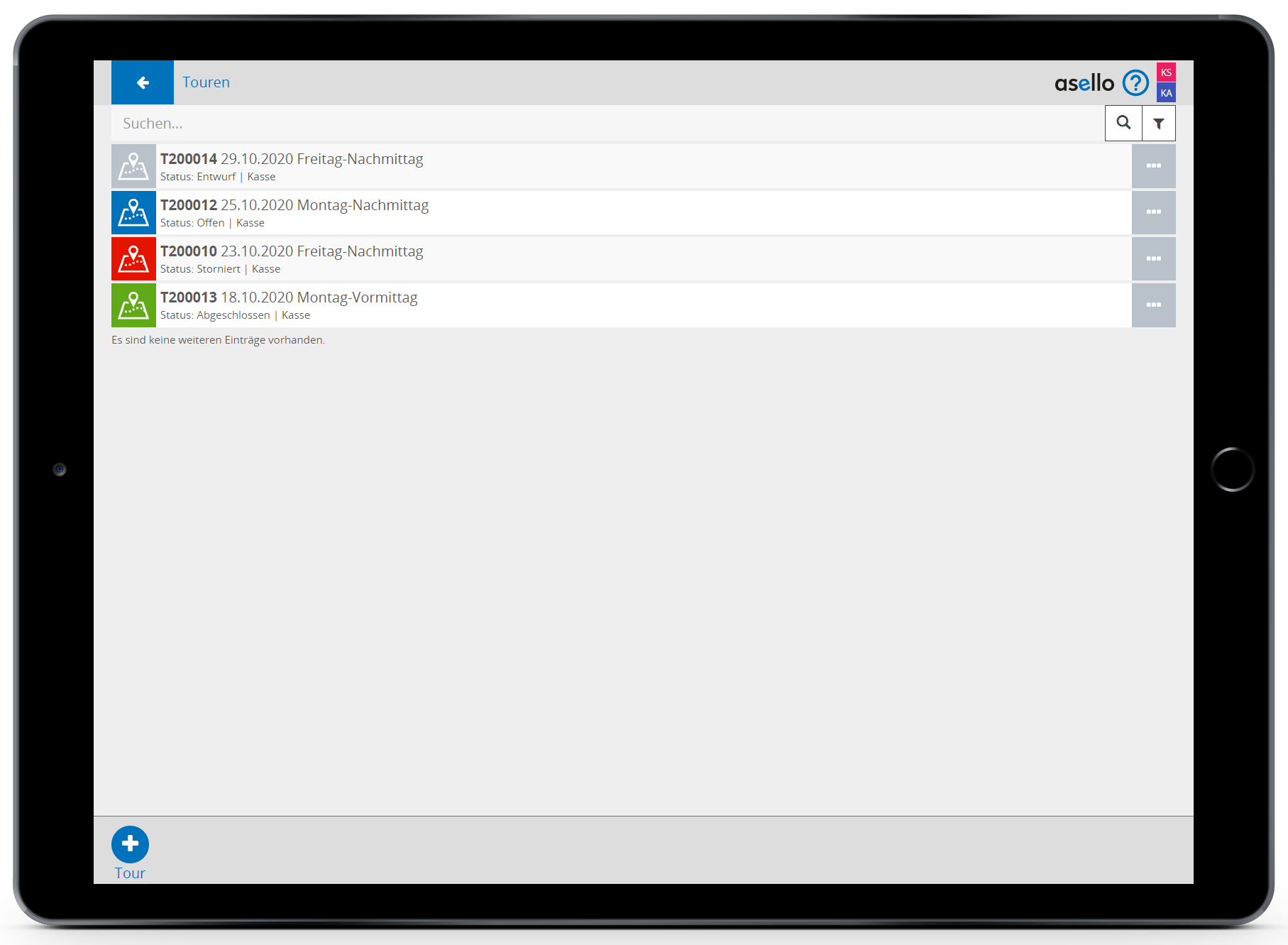 Haben Sie eine geplante Tour veröffentlicht und wurde diese als aktuelle Tour abgearbeitet wird Ihnen die abgeschlossene Tour in der Übersicht der Touren mit der Farbe grün und dem Status „Abgeschlossen“ angezeigt.