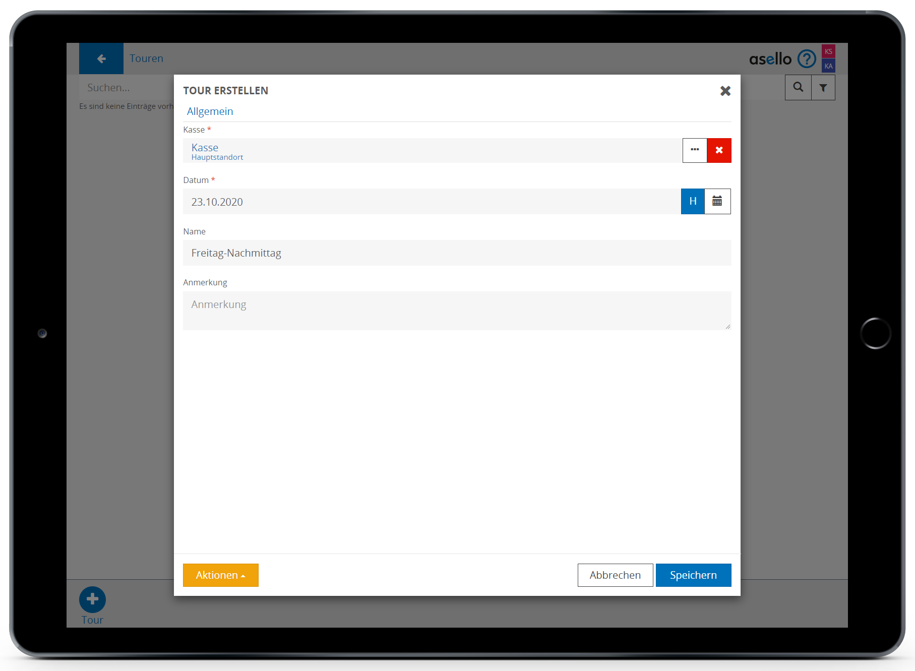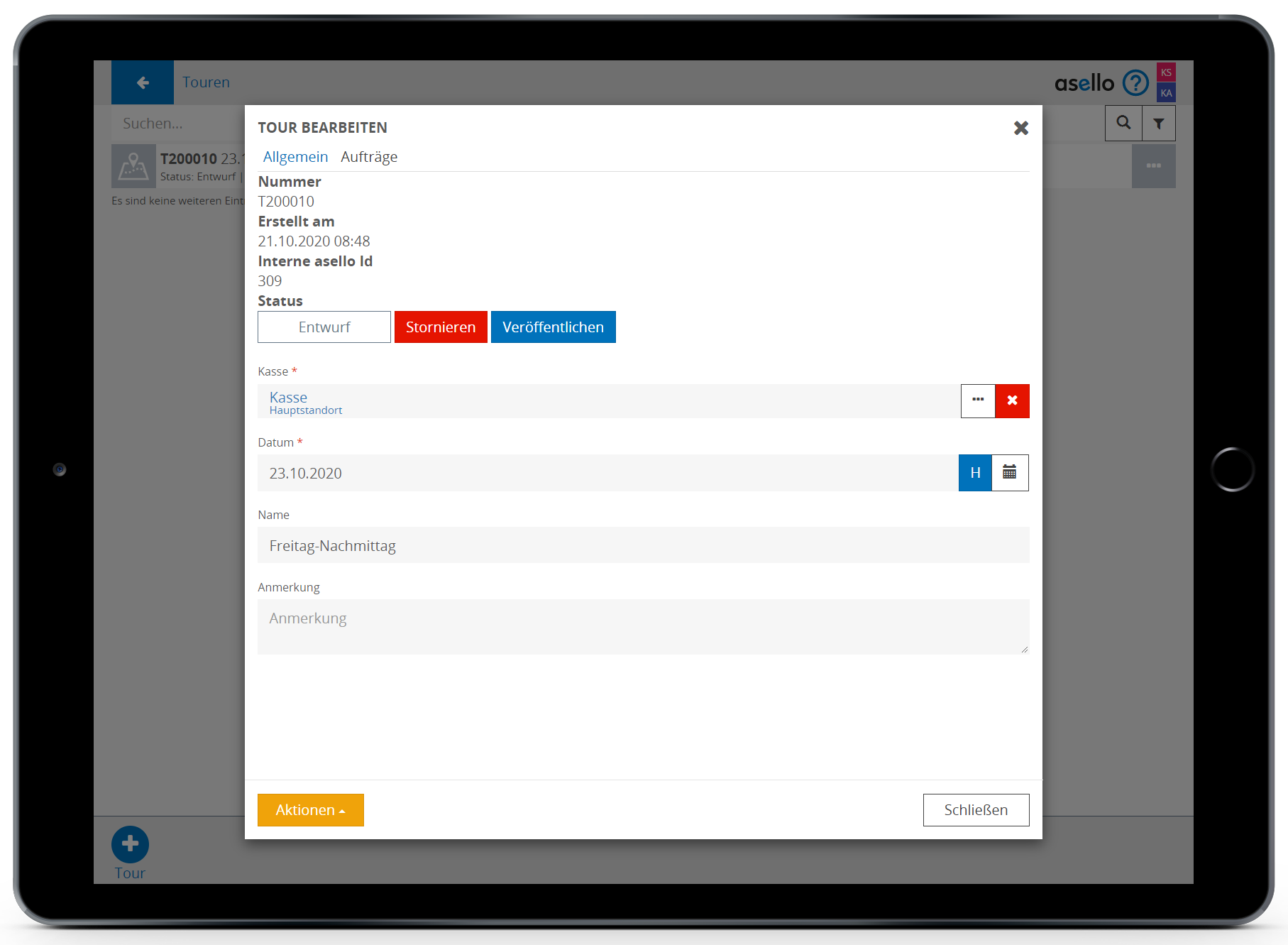 Klicken Sie im linken unteren Eck auf das blaue Plus-Symbol, um eine neue Tour zu planen. Wählen Sie zuerst die Kasse aus, mit der die Aufträge der Tour abgerechnet werden sollen. Danach wählen Sie das Datum aus, an dem Sie Ihre Tour durchführen möchten. Zusätzlich können Sie der Tour noch einen Namen geben und eine Anmerkung hinzufügen. Klicken Sie in der rechten unteren Ecke auf den blauen Button „Speichern“, um die neue Tour zu erstellen. Haben Sie die neue Tour gespeichert, wird diese mit der Farbe grau und dem Status „Entwurf“ in der Übersicht angezeigt.