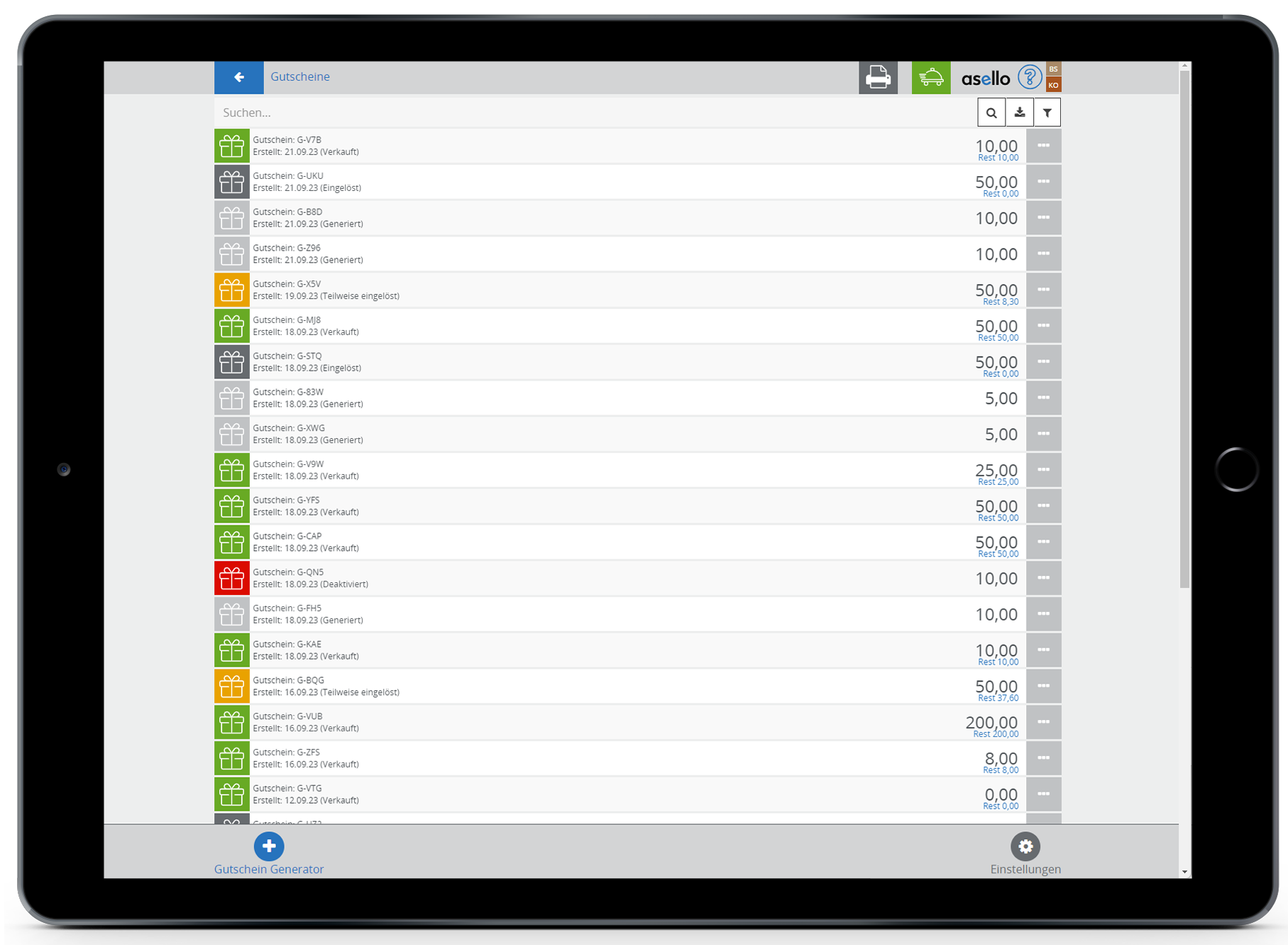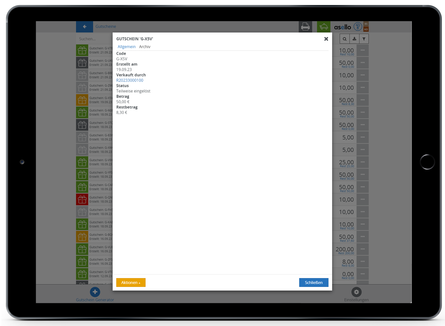 Orange (Teilweise eingelöst): Der Gutschein wurde bereits teilweise eingelöst, der Restwert ist noch offen.