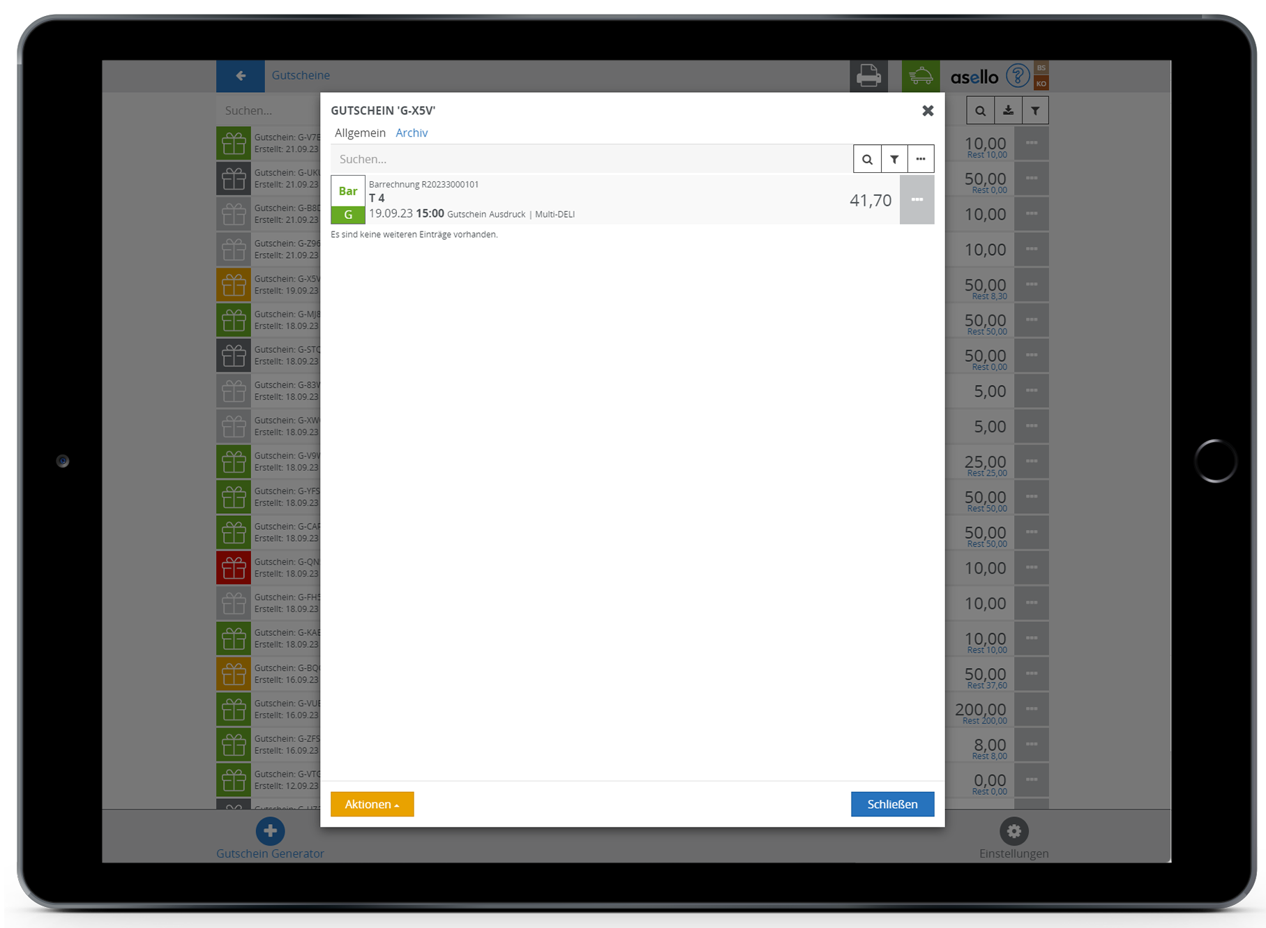 Auf der Registerkarte Archiv werden alle Rechnungen aufgelistet, für die der Gutschein eingelöst wurde. Um das Fenster zu schließen, klicken Sie auf die blaue Schaltfläche „Schließen" in der rechten unteren Ecke.