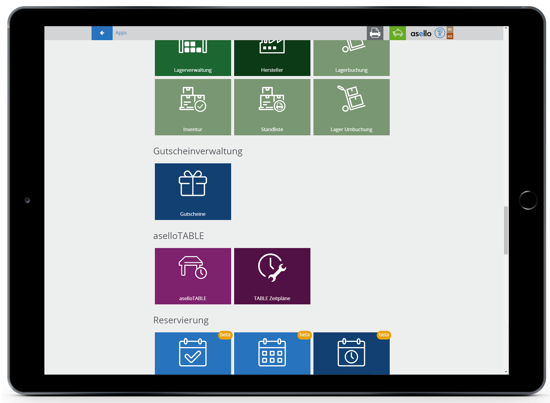 Um zur Gutscheinverwaltung zu gelangen, klicken Sie auf der asello-Startseite oben links auf das blaue Symbol "App-Menü" und anschließend im Bereich "Gutscheinverwaltung" auf die blaue Kachel „Gutschein“.