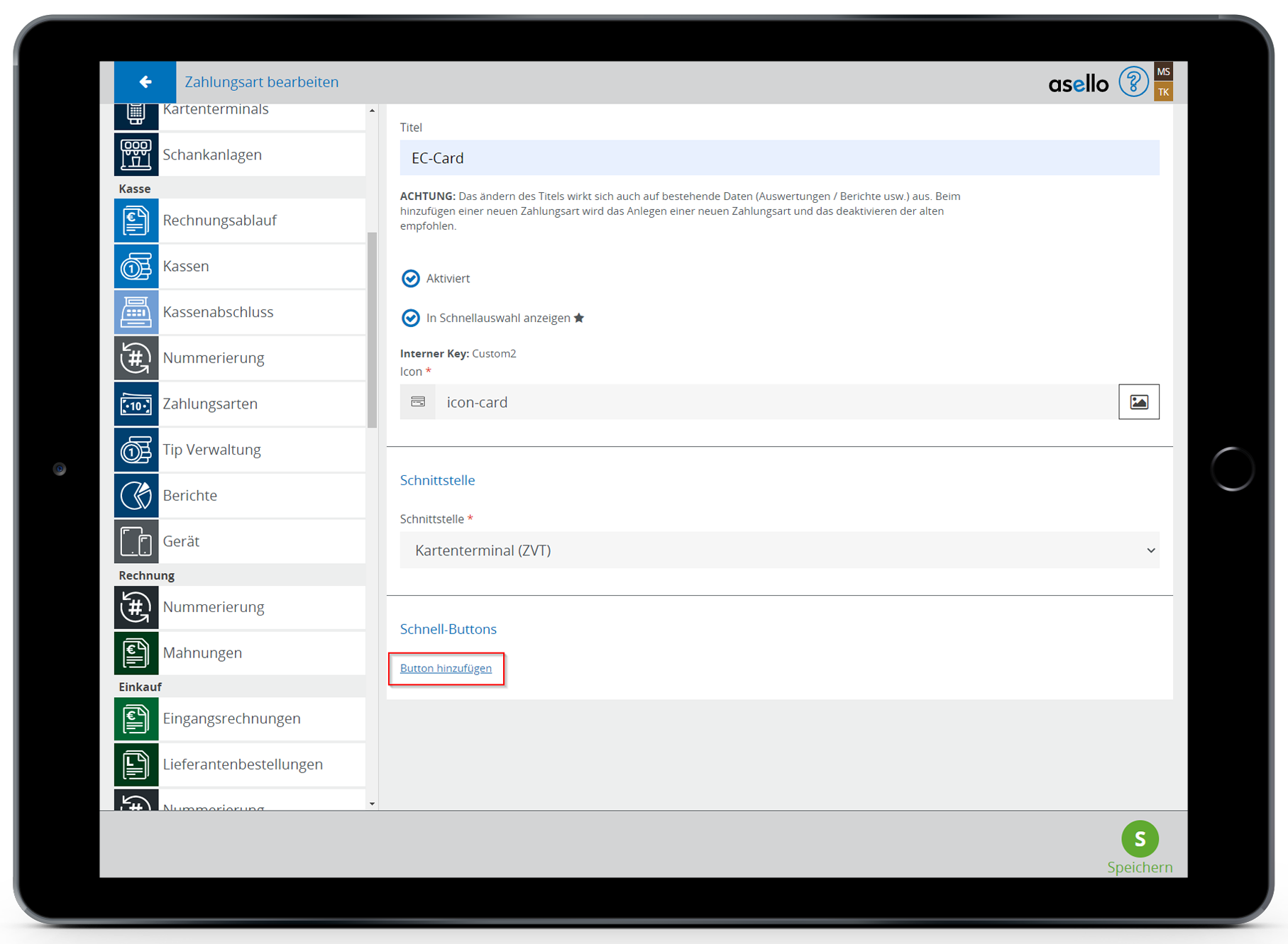 Wenn Sie die Zahlungsart als Schnell-Button beim Zahlungsassistenten einbinden wollen, klicken Sie auf das Feld "Button hinzufügen".