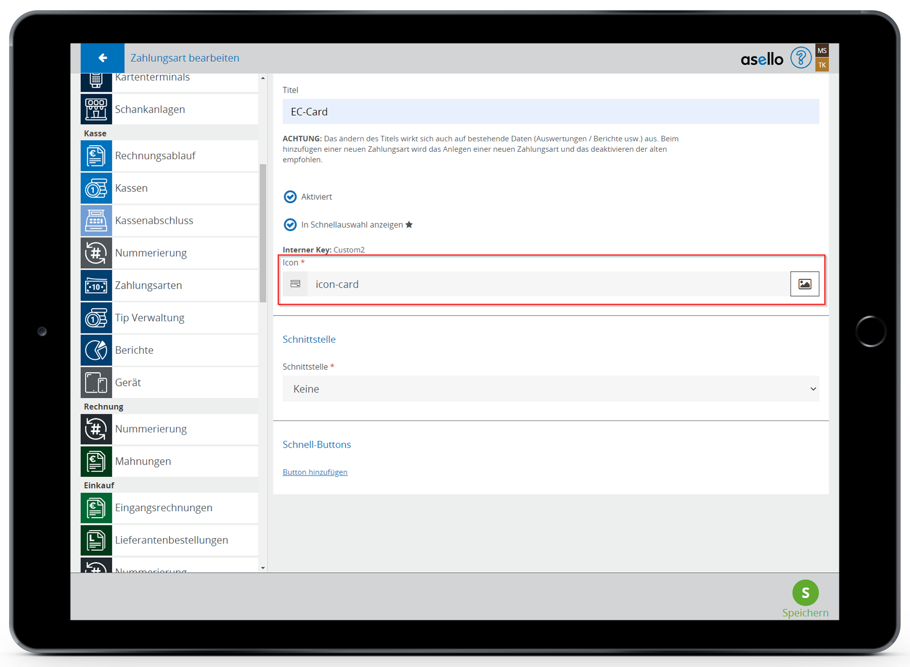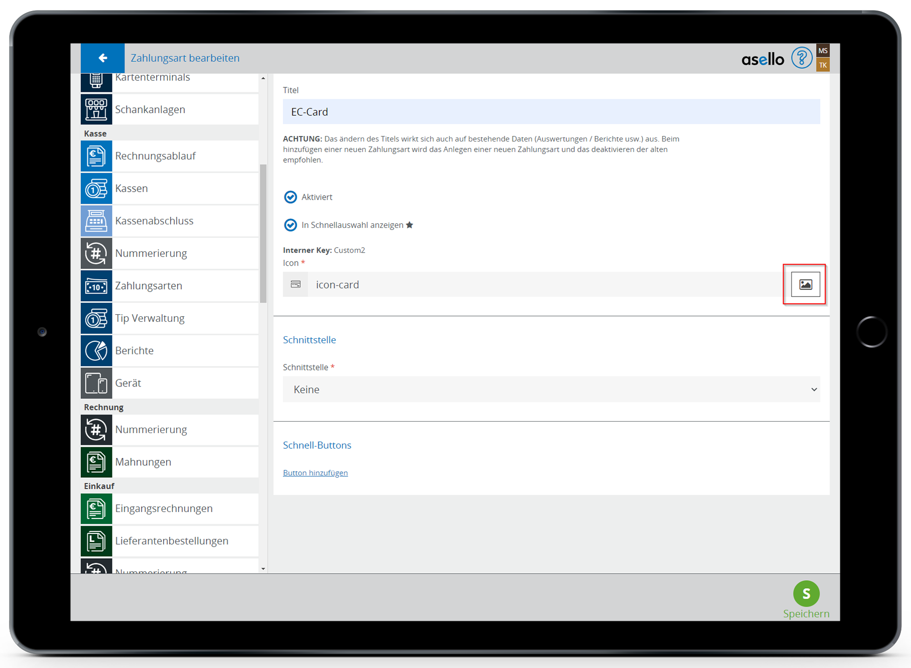 Beim nächsten Punkt können Sie ein Icon für die Zahlungsart bestimmen. Der Name des ausgewählten Icons wird im Feld angezeigt.