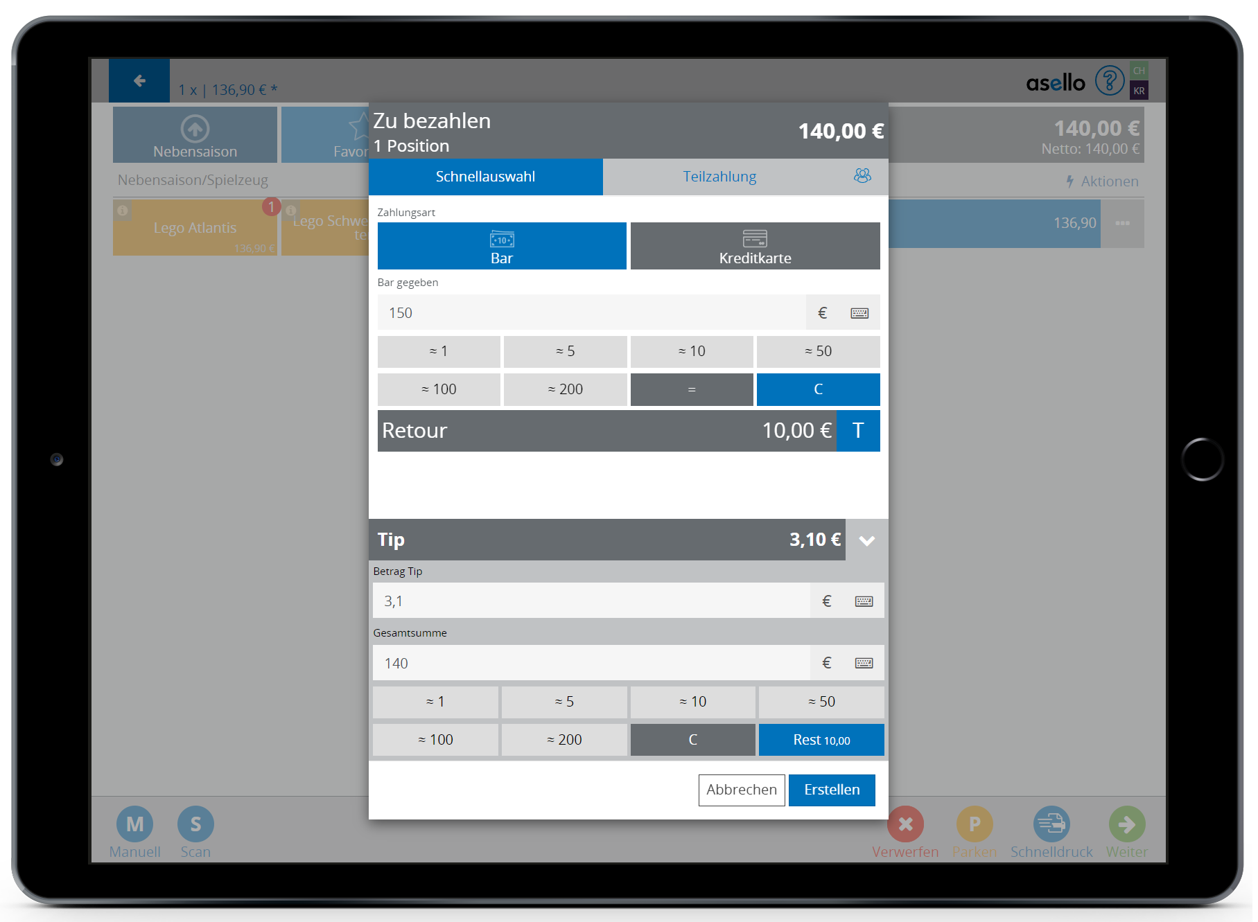 Wiederholen Sie diese Schritte nun, bis die gesamte Rechnung gedeckt ist. Ganz unten können Sie in Rot den Fehlbetrag der Rechnung erkennen, welcher noch zu bezahlen ist. Über dem Fehlbetrag können Sie ebenfalls ein Trinkgeld festlegen. Sobald der Rechnungsbetrag voll gedeckt ist, können Sie rechts unten auf "Erstellen" klicken, um die Rechnungserstellung abzuschließen und den Bon zu drucken.