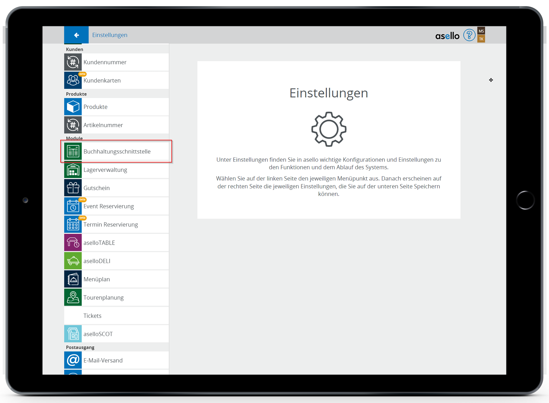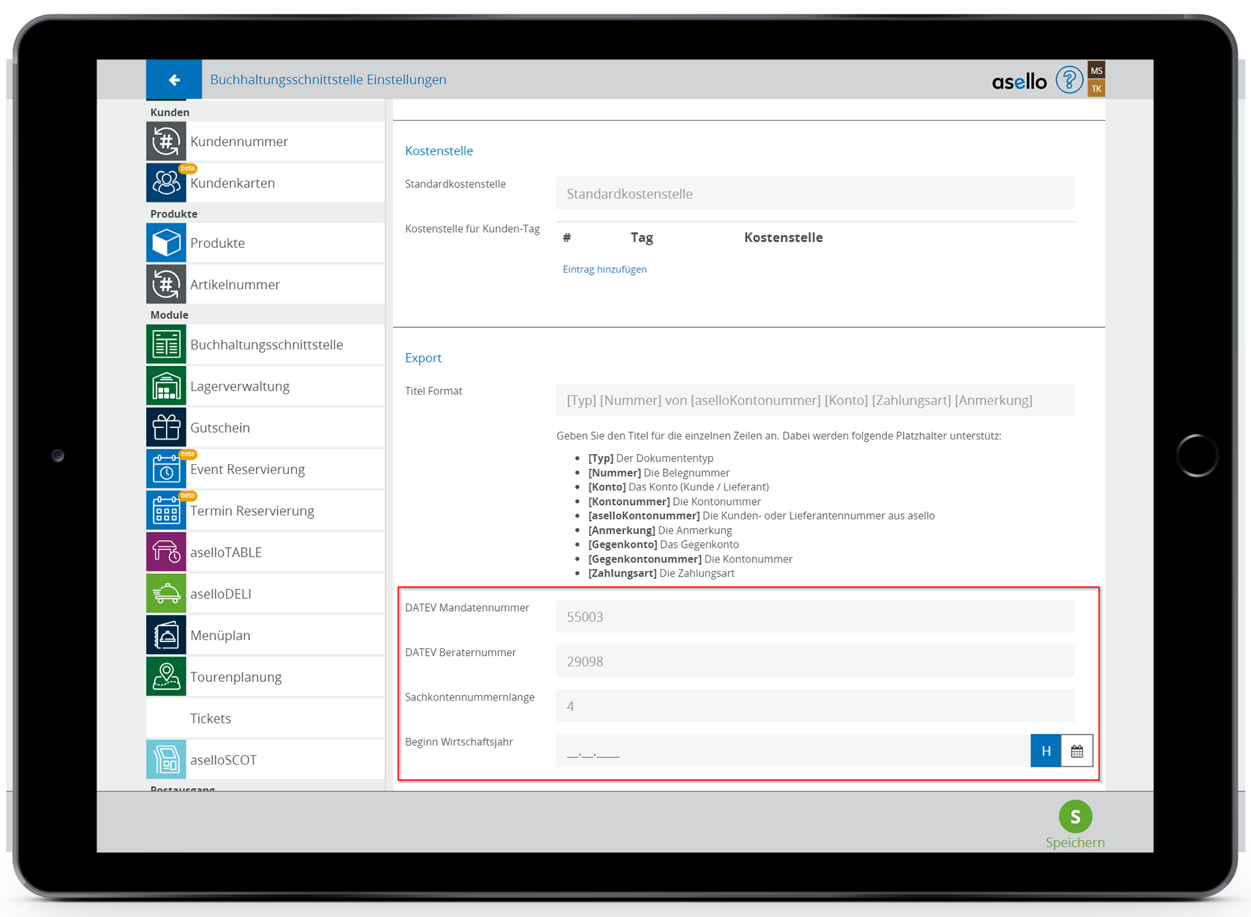 Der Buchhaltungsexport für DATEV benötigt weitere Einstellungen für die Import-Datei. Zu diesen Einstellungen gelangen Sie, indem Sie unter Einstellung zu dem Punkt Buchaltungsschnittstelle navigieren.