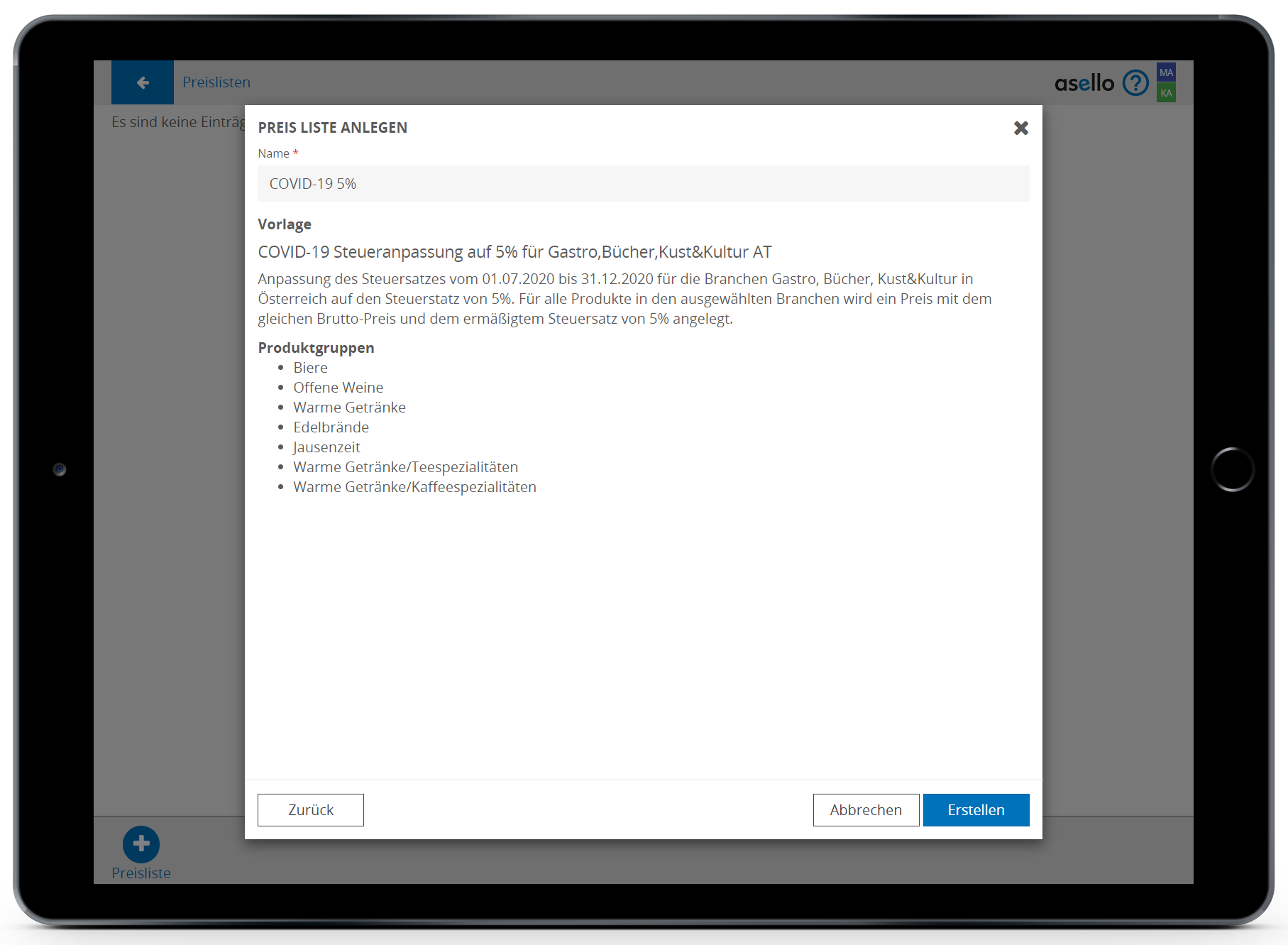 Mit Klick auf den Button "Erstellen" werden alle Produkte aus den ausgewählten Produktgruppen der neuen Preisliste hinzugefügt.