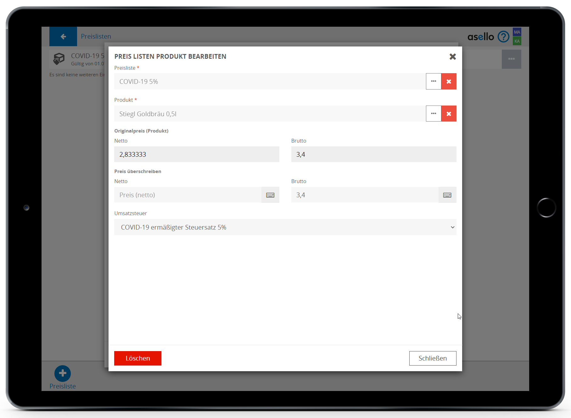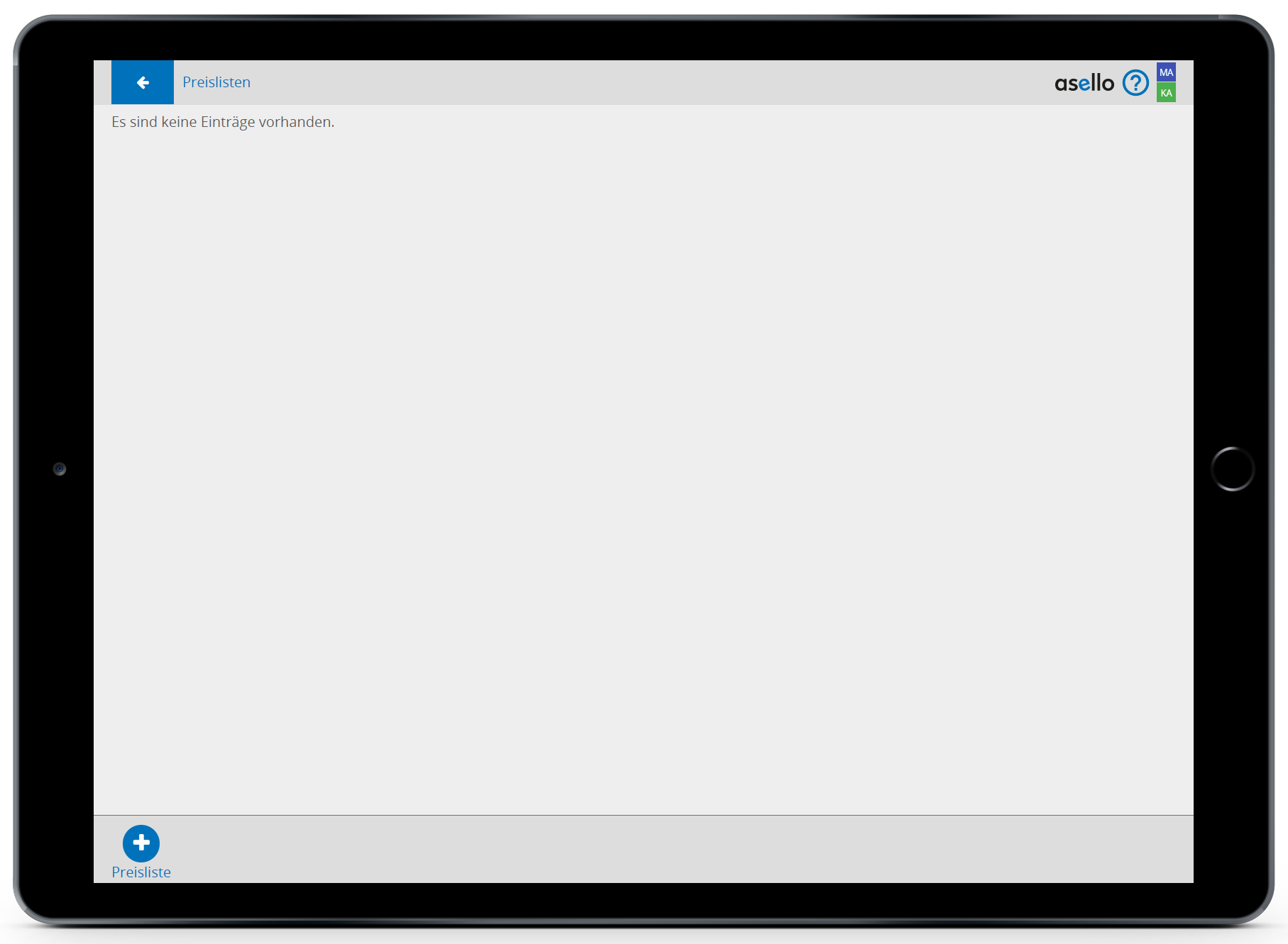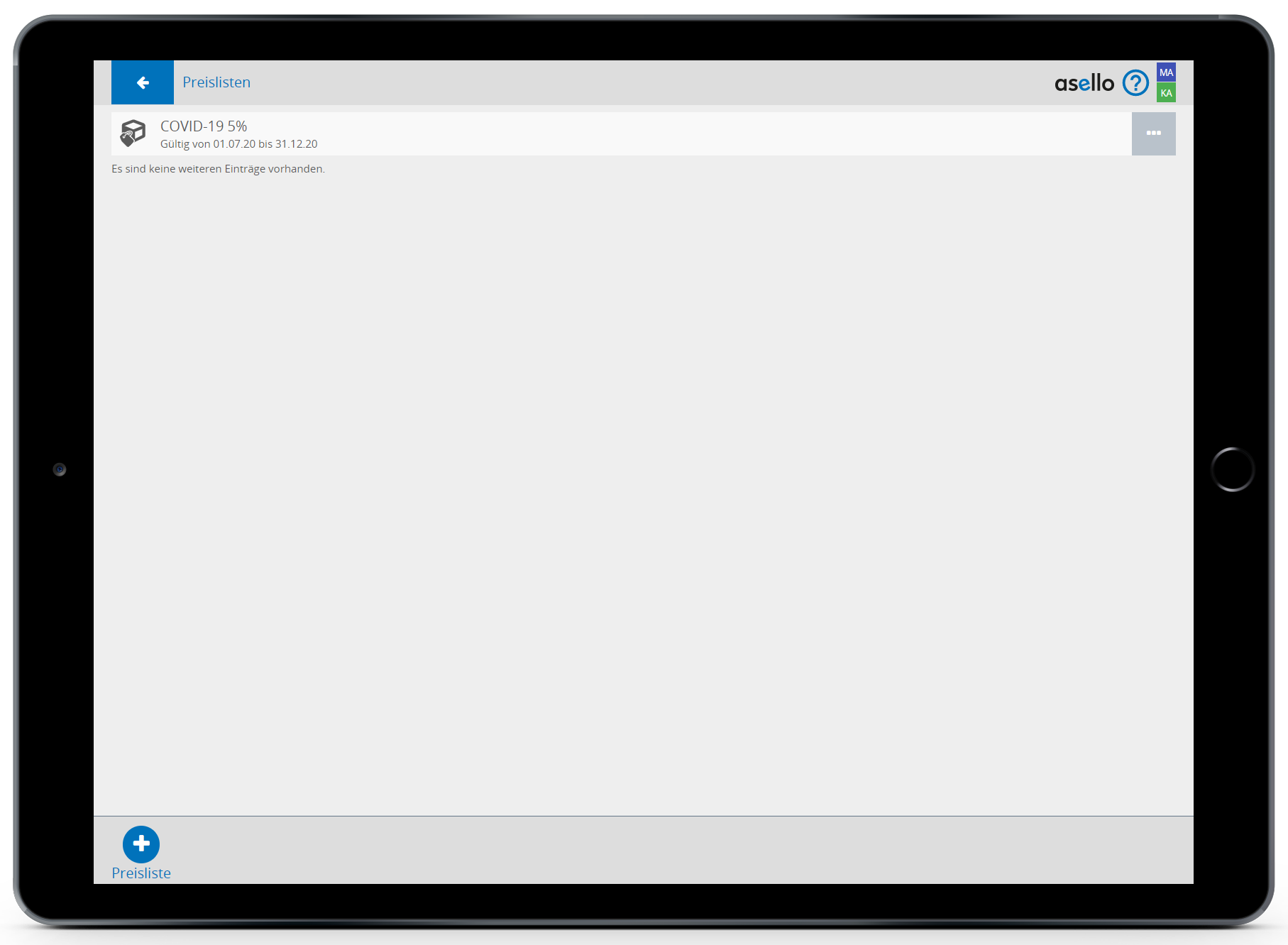 Nach der Bestellung des Preislistenmoduls müssen Sie auf jedem Gerät einmal Einstellungen > Neu laden ausführen.