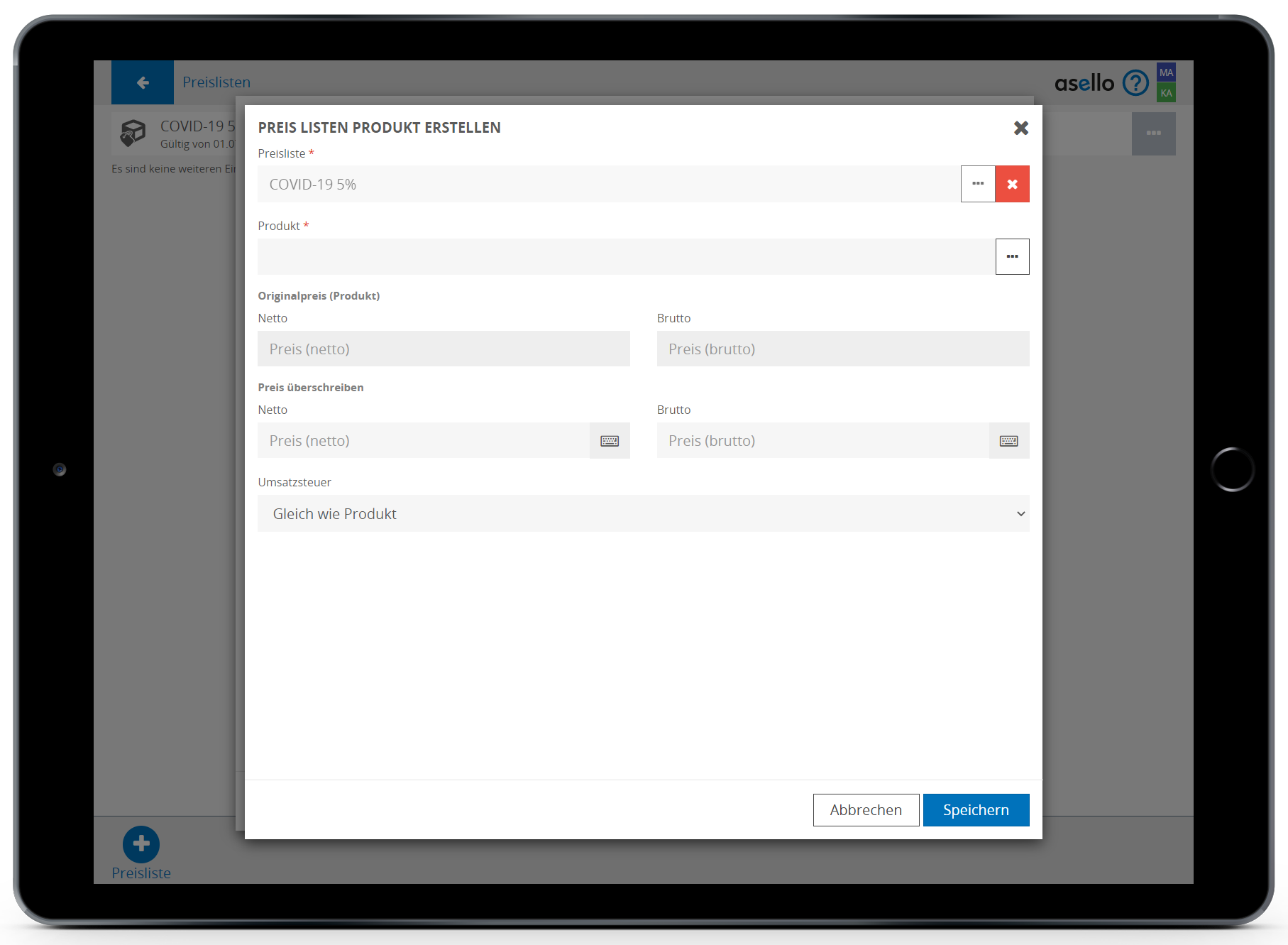 Passen Sie das Produkt entsprechend an und klicken Sie auf "Speichern" um das Produkt der Preisliste hinzuzufügen.