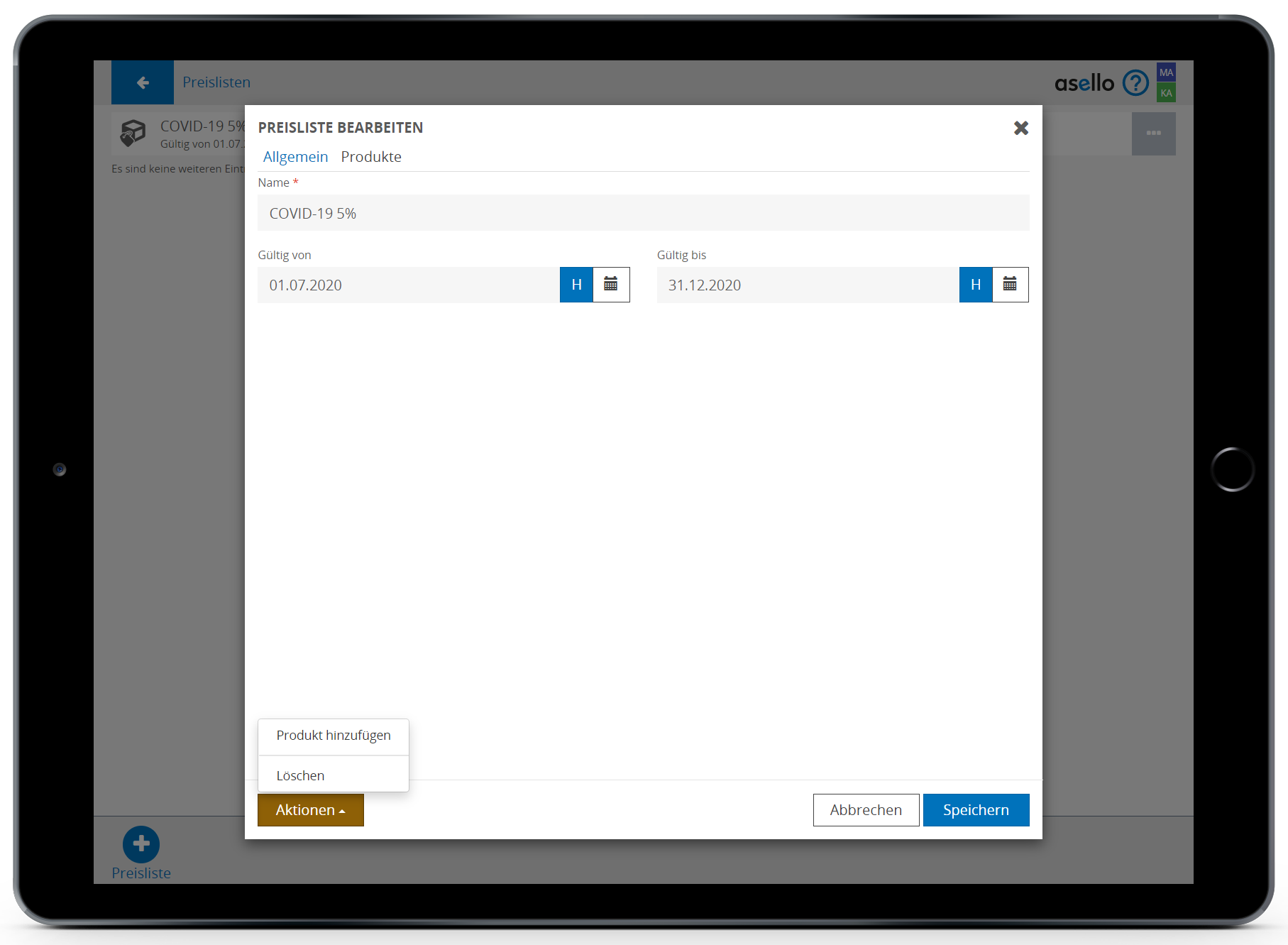 Bei der Vorlage für die "COVID-19 5%" Preisliste ist der Zeitraum von 01.07.2020 - 31.12.2020 voreingestellt. Die neue Preisliste wird somit automatisch am Ende des Jahres deaktiviert und Ihre Produkte verwenden wieder den ursprünglich ausgewählten Steuersatz.