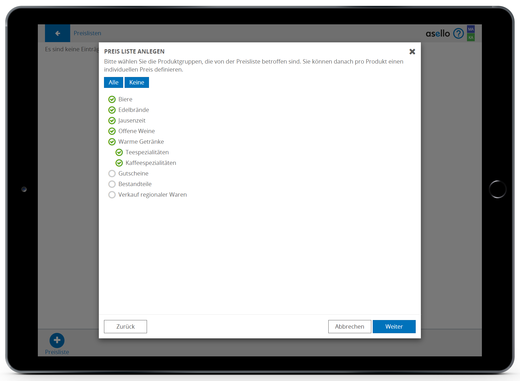 Wählen Sie nun die Produktgruppen aus, für die die neue Preisliste gelten soll. Anschließend klicken Sie auf "Weiter".