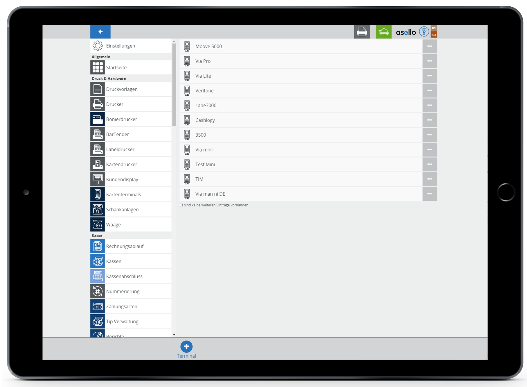 Um das neue Kartenterminal Ihrer asello Kasse hinzuzufügen, drücken Sie auf der Startseite auf das Apps-Symbol im linken oberen Eck und wählen anschließend im Abschnitt "Stammdaten und Einstellungen" die Einstellungen-Kachel. Wählen Sie unter der Überschrift "Druck & Hardware" den Menüpunkt "Kartenterminals" und drücken Sie links unten auf den blauen "+ Terminal" Button.